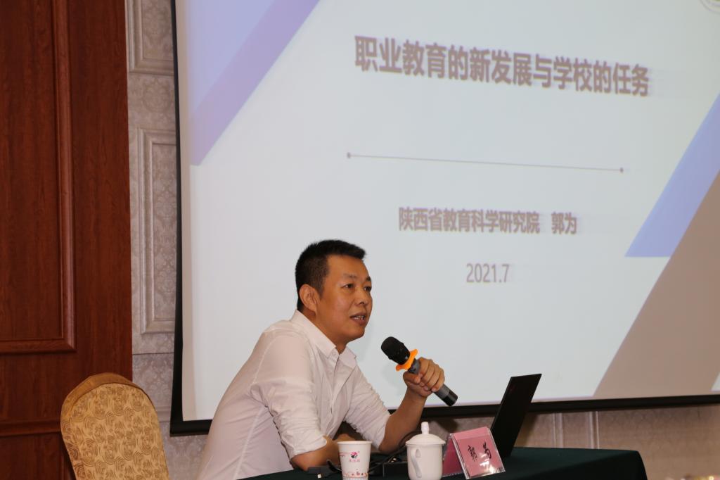 陕西省教育科学研究院郭为教授以《职业教育的新发展与学校的任务》为题作了专题讲座。他首先分析了现阶段我国职业教育面临的问题与挑战,在此基础上,从构建灵活多样的育人模式、大力推进教学模式内容方式变革等五个方面提出构建职业教育新体系的做法,为中职学校信息化发展指明了方向。