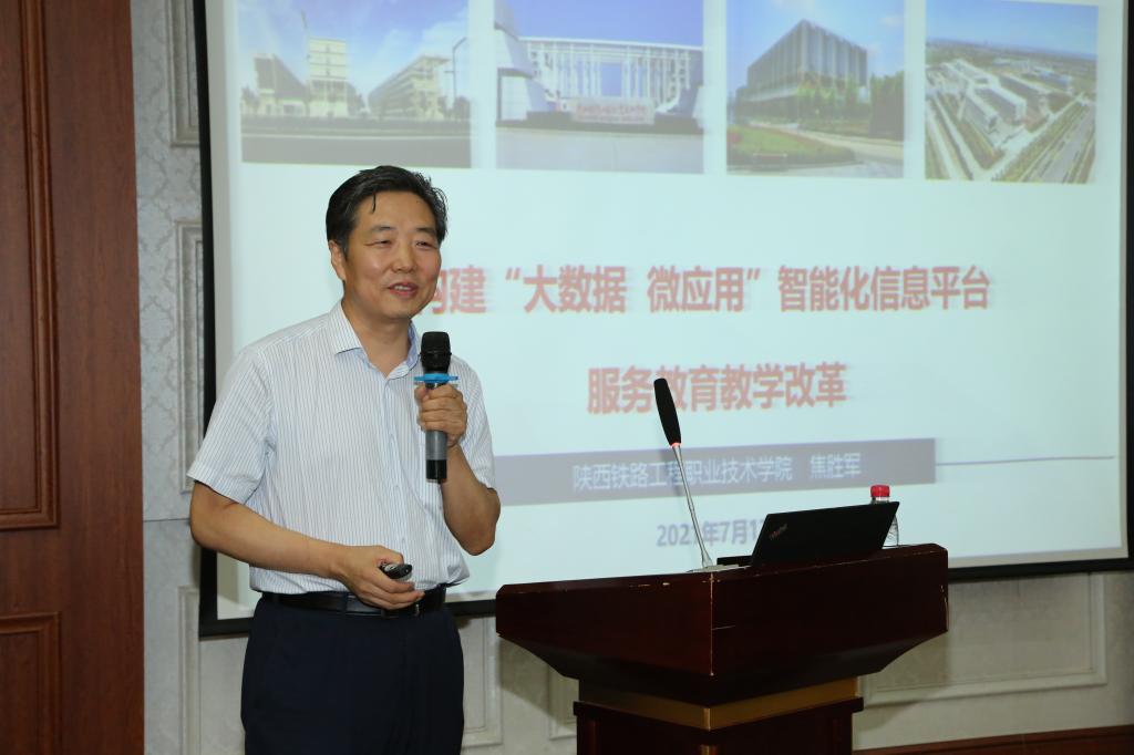 陕西铁路工程职业技术学院校长焦胜军教授作了题为《构建“大数据 微应用”智能信息平台服务教育教学改革》专题报告。他认为,信息化部门要做到“引导不主导,到位不越位”,平台建设要以教学为中心,信息化素养是推进工作的关键。