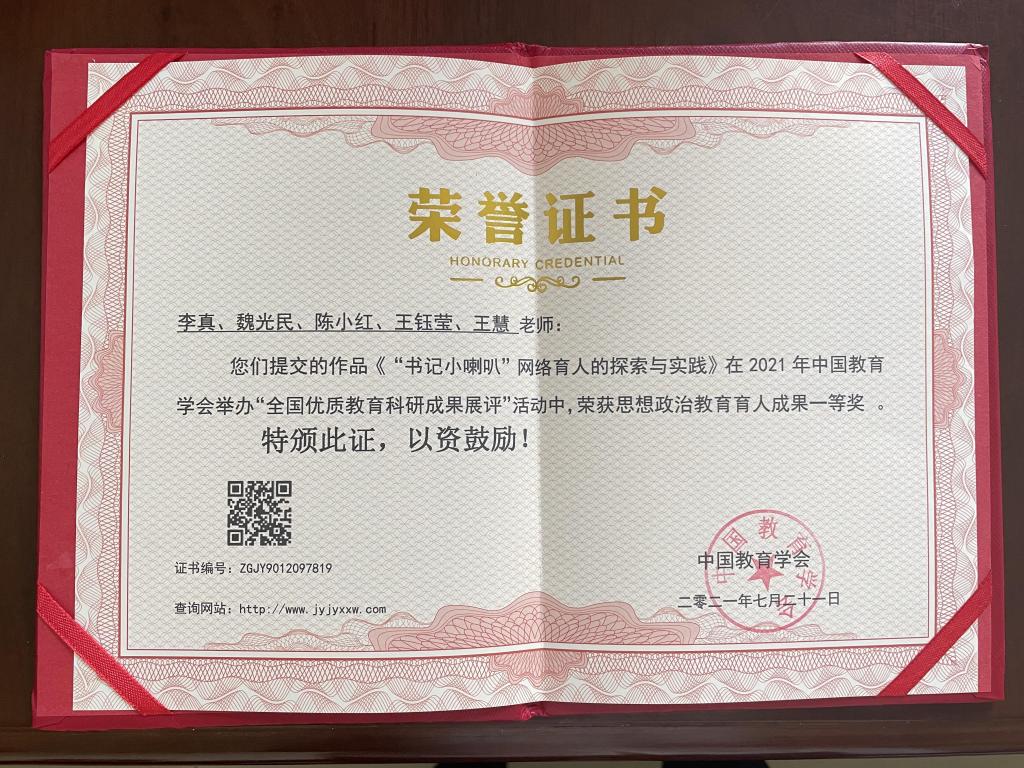 日前,在中国教育学会举办的“全国优质教育科研成果展评”活动中,我校求真育人工作室提交的《“书记小喇叭”网络育人的探索与实践》作品荣获思想政治教育育人成果一等奖。