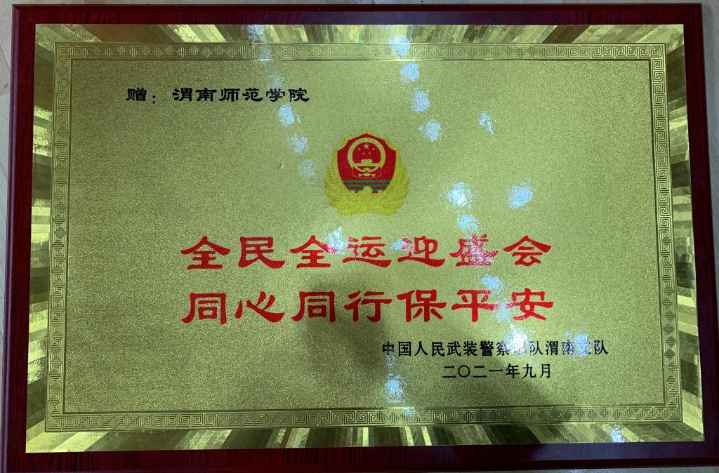 9月23日,中国人民武装警察部队渭南支队赠送我校“全民全运迎盛会,同心同行保平安”牌匾。武警渭南支队副参谋长赵玉龙、勤务保障大队大队长王顺合,十四运篮球项目竞委会(渭南赛区)副主任、副校长王菊霞,学校十四运竞委会相关人员参加赠送仪式。