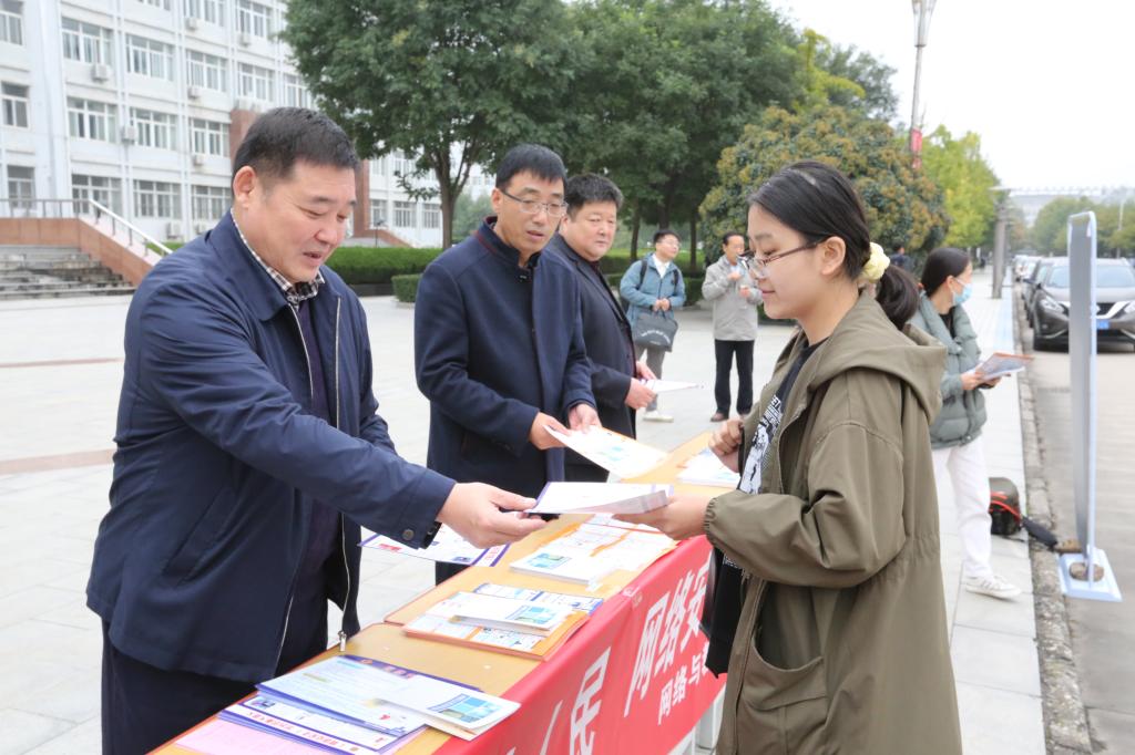 10月13日上午,学校联合渭南市公安局网监支队、渭南市临渭区公安局网监大队在厚德楼前举行了“网络安全主题日”活动。为增强宣传效果,党委网信办邀请渭南市公安局网监支队、渭南市临渭区公安局网监大队联合学校稳定办、保卫处、学生工作部等部门共同举办这次活动。党委书记卓宇、党委副书记韩小卫一行在宣传地点查看了网络安全知识宣传展板,听取了宣传周活动总体安排,并分发网络安全宣传彩页、网络法规书籍等。