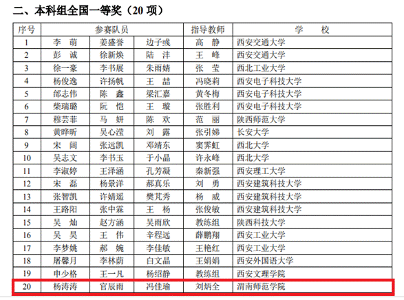 近日,陕西省教育厅办公室发文公布了2021年全国大学生数学建模竞赛陕西赛区获奖名单,我校有44支队伍参加本次竞赛,22支队伍获奖(获奖率50%),其中杨涛涛、官辰雨、冯佳瑜三位同学组成的参赛队喜获全国一等奖,李雨蔓、冯易炫、罗星美同学组成的参赛队荣获全国二等奖。另外,我校有4支参赛队喜获陕西赛区一等奖,16支参赛队伍喜获陕西赛区二等奖,刘炳全荣获陕西赛区优秀指导教师。