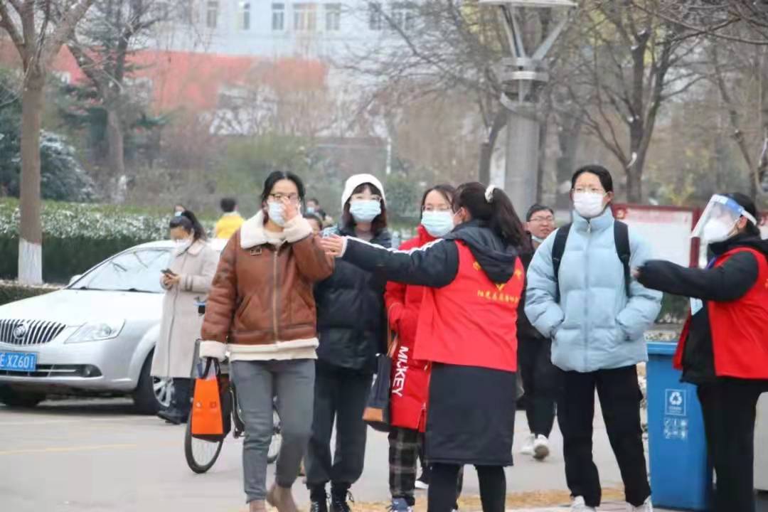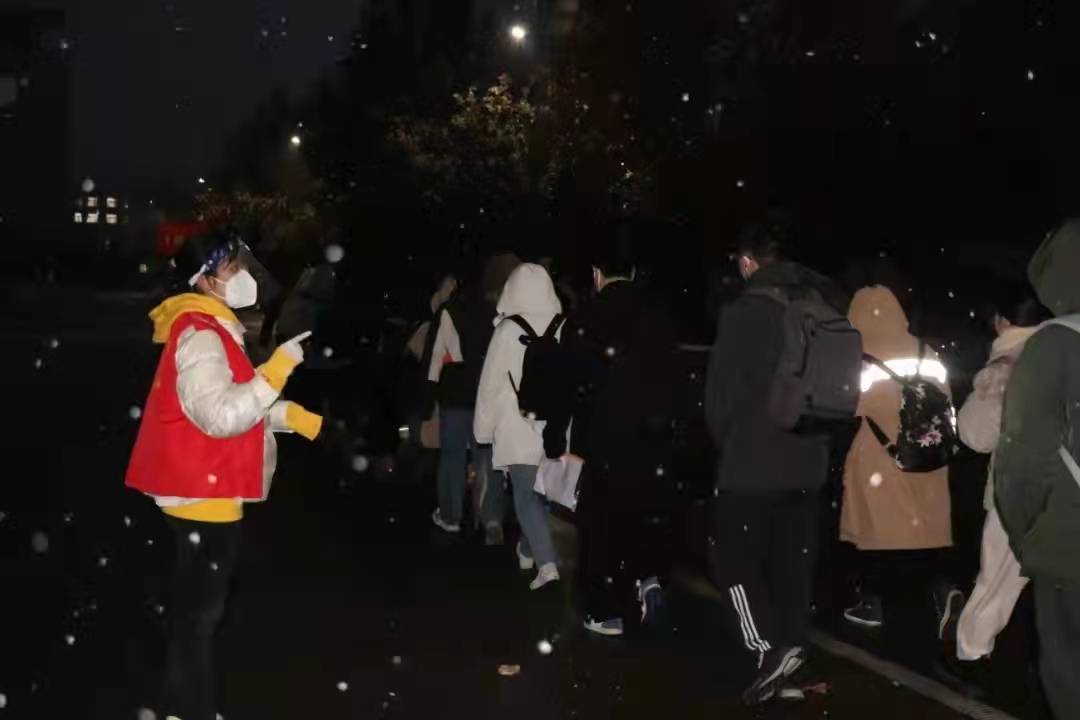 考研工作历时三天,渭南地区迎来第一场降雪,室外温度低至零下6度,志愿者们不畏严寒,6:20准时在指定地点集合,佩戴防护面具、穿好防护服、领取消杀工具,按照岗位分工井然有序上岗。在入校检测岗位,志愿者检查考生安全承诺书,协助防疫工作人员测量体温,查看考生健康码行程码,为考生安全和校园安全筑起坚实屏障;在交通疏导岗位,志愿者坚守在各个路口,配合保安指挥交通维持着道路秩序;在校内服务岗位,志愿者引导考生有序分流到休息区、用餐区;在点对点引导岗位,志愿者手举引导牌,按指定路线将防疫管控考生迎进、送出,全力配合我校疫情防控工作安排;在机动岗位,志愿者随时待命,紧急处理物资调配、转运等工作任务。志愿服如同白雪纷飞里燃起的火把,点燃校园的每一个角落,让寒风中的校园也多了一丝暖意,温暖了每一位在寒风中追逐梦想的考生。