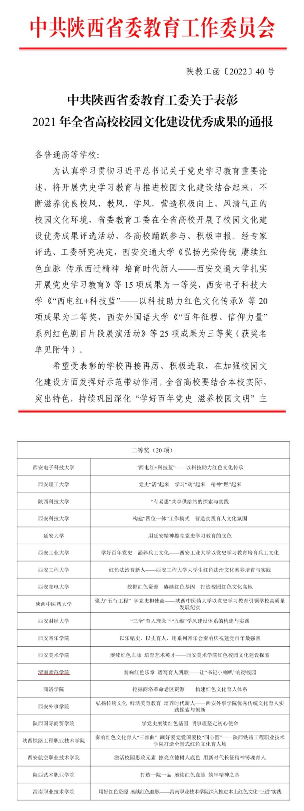 近日,中共陕西省委教育工委发文表彰2021年全省高校校园文化建设优秀成果奖,经学校党委宣传部评选推荐、“求真育人”工作室申报的“奏响红色乐章,谱写育人凯歌——让书记小喇叭响彻校园”成果荣获二等奖。