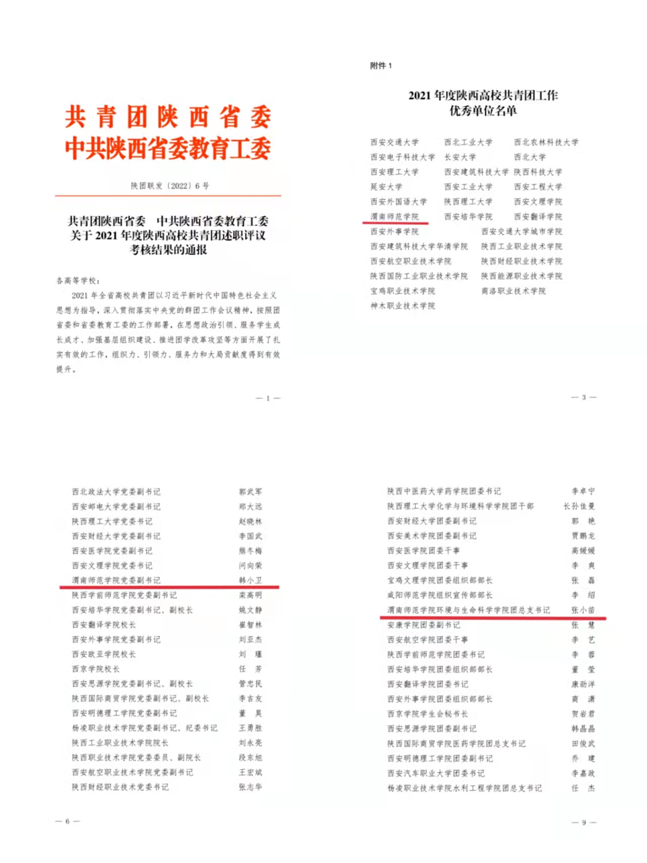 近日,由共青团陕西省委、中共陕西省委教育工委联合印发的《关于2022年度陕西高校共青团述职评议考核结果的通报》中,我校被评为“2021年度陕西高校共青团工作优秀单位”,党委副书记韩小卫被评为“2021年度陕西高校支持共青团工作好书记”,环境与生命科学学院团总支书记张小苗同志被评为“2021年度陕西高校共青团工作先进个人”。