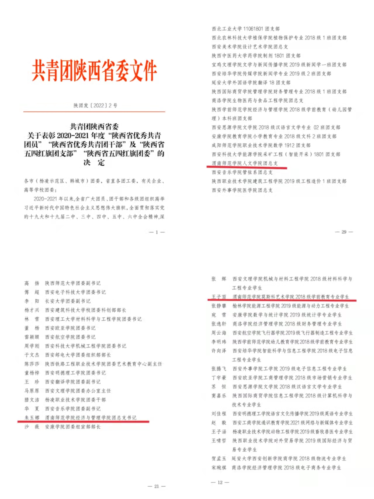 由共青团陕西省委印发的《关于表彰2020-2021年度“陕西省优秀共青团员”“陕西省优秀共青团干部”及“陕西省五四红旗团支部”“陕西省五四红旗团委”的决定》中,我校人文学院团总支获得2020-2021年度“陕西省五四红旗团支部”,经济与管理学院团总支书记朱玉娜获得2020-2021 年度“陕西省优秀共青团干部”,莫斯科艺术学院2018级学前教育专业学生王子茵获得2020-2021年度“陕西省优秀共青团员”。