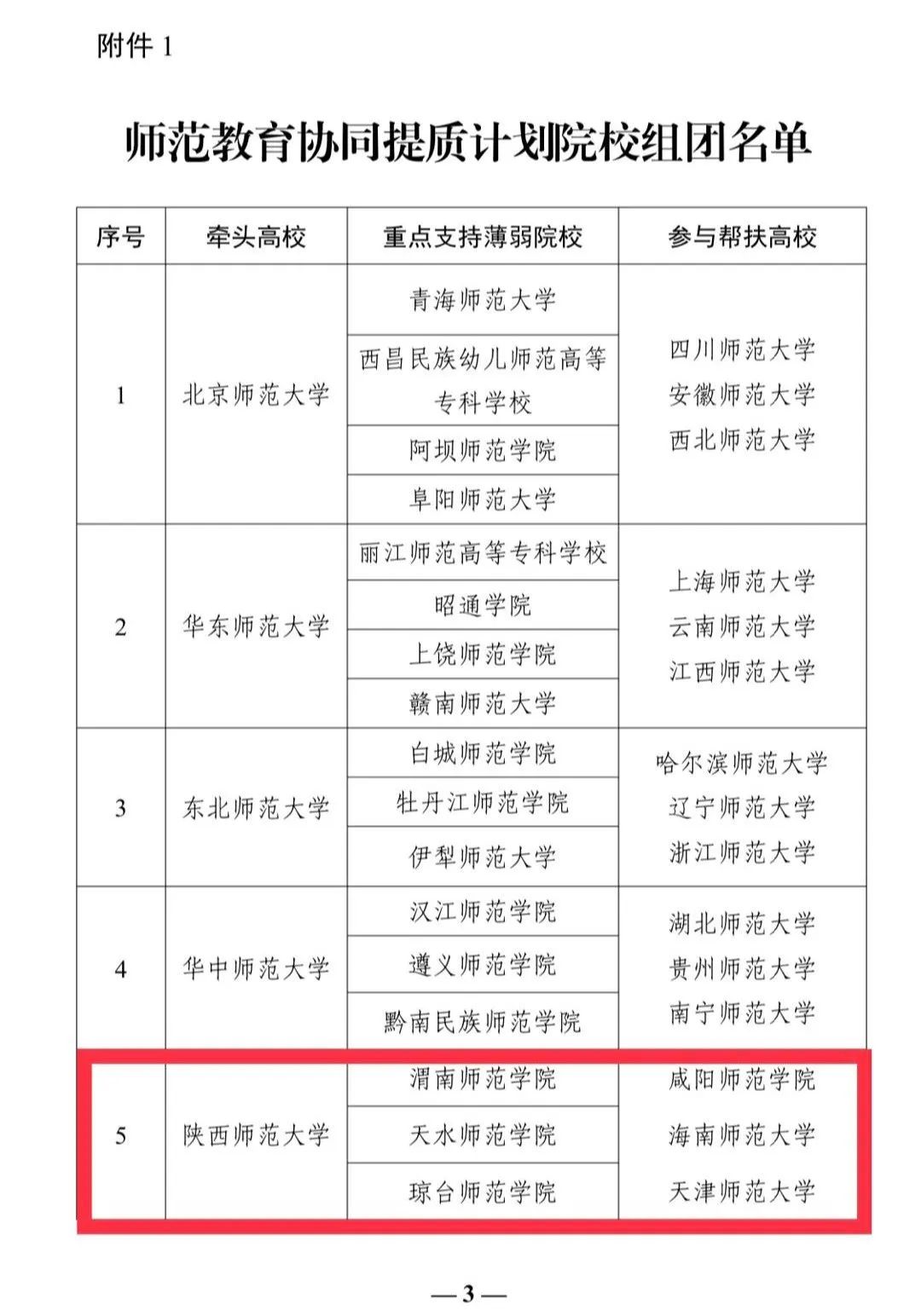 经各省教育厅推荐,教育部通过前期调研、形式审查、专家评议等环节,最终确定由北京师范大学、华东师范大学、东北师范大学、陕西师范大学、西南大学、首都师范大学、湖南师范大学、南京师范大学、华南师范大学等10所知名师范大学牵头,30所高水平师范院校参与,支持帮扶32所地方薄弱师范院校。根据教育部安排,将由陕西师范大学牵头,天津师范大学、海南师范大学、咸阳师范学院组团参与,对我校进行重点帮扶。