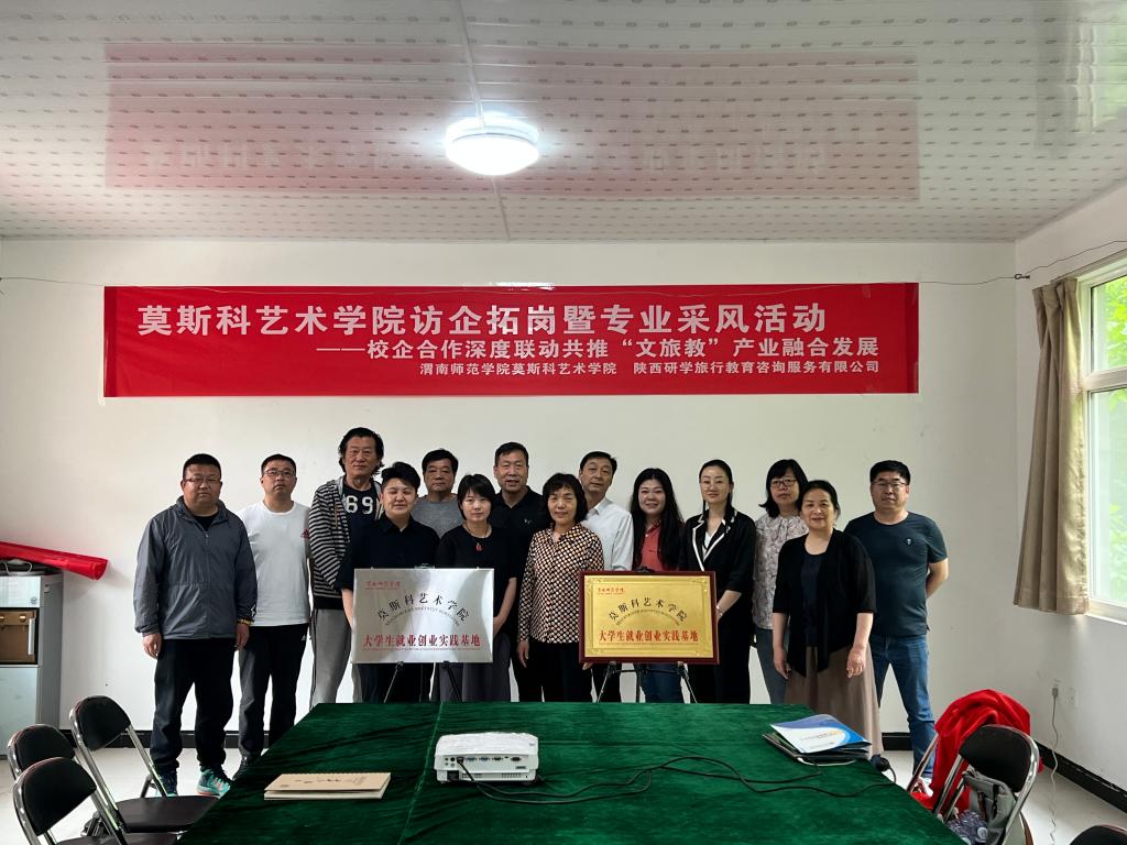 在华山写生基地,举行共建大学生就业创业实践基地签约挂牌仪式。陕西研学旅行教育董事长乔海旭致欢迎词并介绍企业基本情况,和近几年发展取得的成绩,表示此次活动是校企合作深度联动,共推“文旅教”产业融合发展的具体实践。总经理屈娟对校企合作及未来共建的方向作了介绍。石明对莫斯科艺术学院基本情况进行介绍,并表示学院一直致力于探索秦东非遗传承推广新模式,希望通过此次实地走访,深度了解企业对学生知识、能力及素质的要求,不断增强人才培养的针对性和适应性。双方在座谈交流后,达成共建意向。孟波与乔海旭共同签订“共建大学生就业基地”协议并举行授牌仪式。