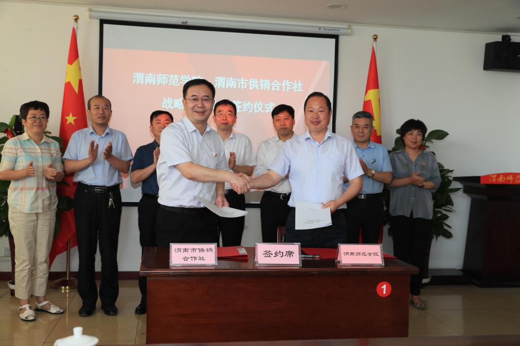 在双方代表的见证下,汪勇、邱学军代表双方签订了《渭南师范学院 渭南市供销合作社战略合作框架协议》。