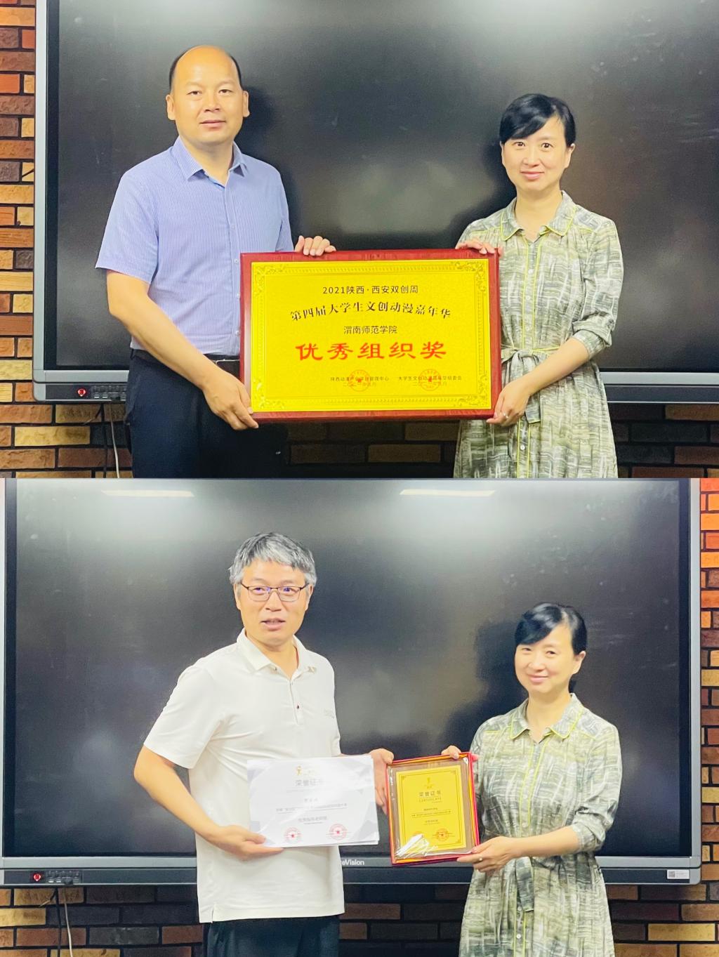 同时,肖真为我校传媒学院颁发了“新光奖”2021年中国西安国际原创动漫大赛优秀奖、第四届大学生文创动漫嘉年华优秀组织奖等荣誉证书。