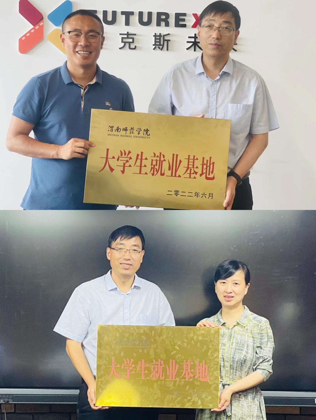 座谈会上,韩小卫代表学校向陕西动漫产业平台管理中心、爱克斯未来有限公司两家企业授渭南师范学院大学生就业基地牌。