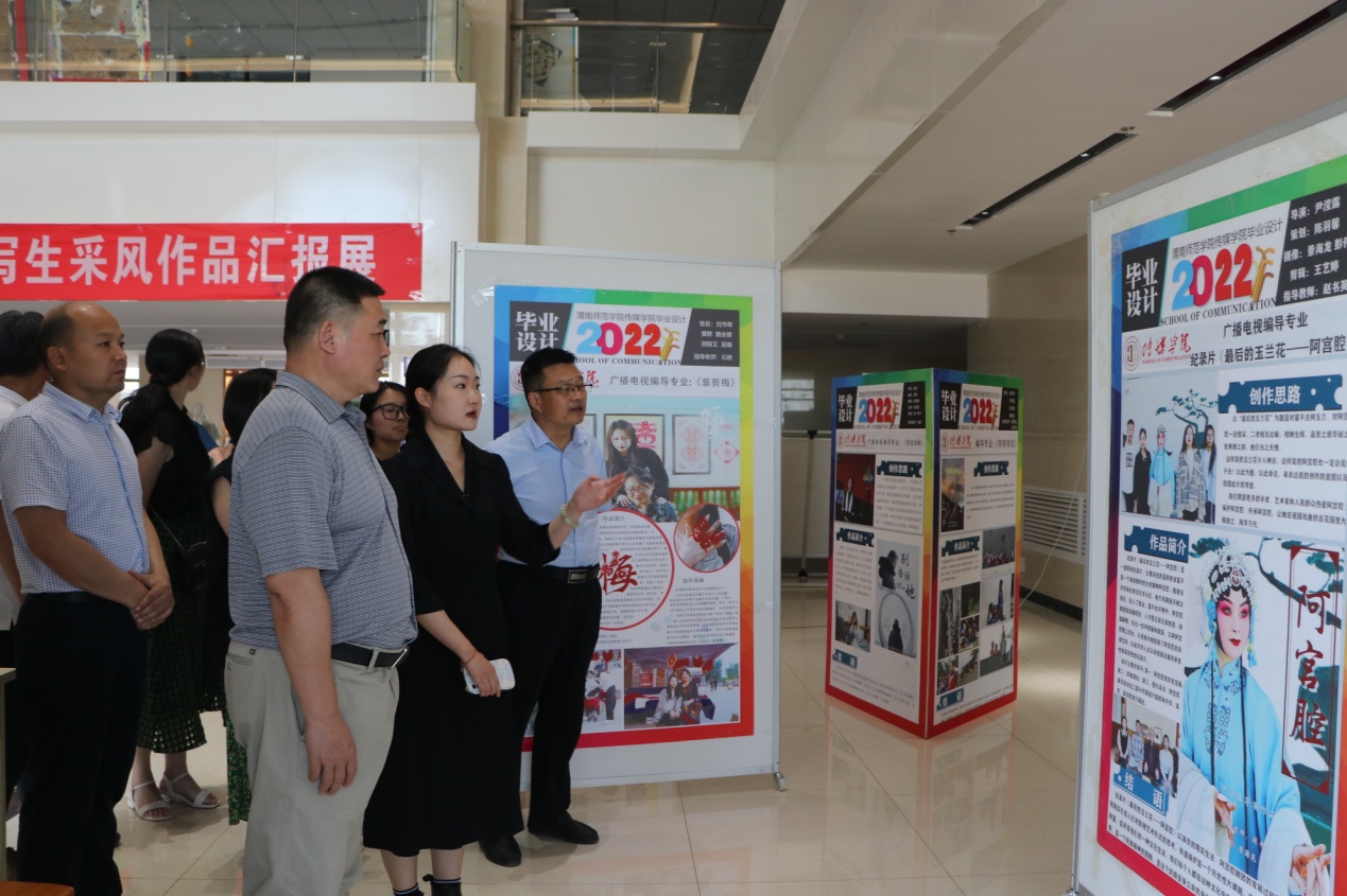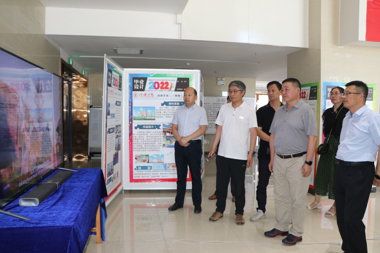 6月15日下午,党委书记卓宇到富平校区指导传媒学院喜迎二十大2022届毕业设计作品展。