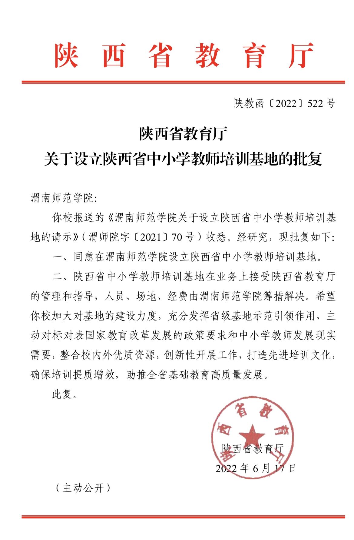 6月17日,陕西省教育厅印发《关于设立陕西省中小学教师培训基地的批复》(陕教函〔2022〕522号),同意在我校设立“陕西省中小学教师培训基地”。这是我省设立的第5个中小学教师培训基地,也是在陕西非省会城市高校中设立的首个基地。