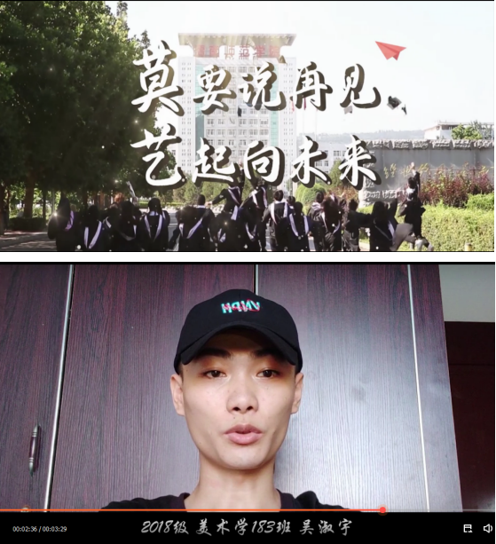 在《莫要说再见,艺起向未来》的毕业纪念短片中,于今年5月被诊断为白血病的2018级美术学专业吴淑宇同学录制了毕业祝福视频,表示自己因身体原因很遗憾不能和大家一起在现场参加毕业典礼,但很开心和大家一起共度大学时光,顺利毕业,感谢老师们的帮助和同学们的关心,祝大家毕业快乐,前程似锦!全场师生感动不已,掌声雷动,齐喊“祝吴淑宇早日康复,加油!”