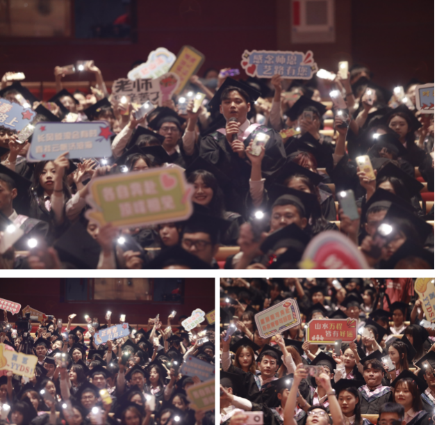 卢爱刚、席景奇逐一为毕业生拨穗正冠,颁发学位证书,并送上殷殷嘱托与衷心祝福,毕业生们与台上老师深情拥抱致谢。