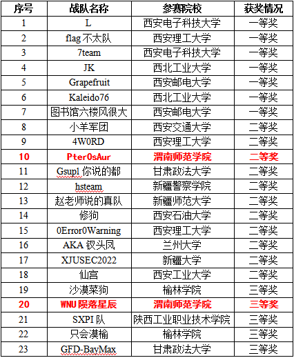 7月3日,第十五届全国大学生信息安全竞赛创新实践能力赛——西北地区赛获奖名单揭晓。本次大赛来自西安交通大学、西北工业大学、兰州大学、西安电子科技大学、新疆大学、西安理工大学、西安工业大学和武警工程大学等西北赛区38个高校共209支队伍参与比赛,最后32支队伍获奖。我校教师葛莉指导的“Pter0sAur”战队(王立科、苗竞舟、田浩、王首龙)获得二等奖;李云飞指导的“WNU陨落星辰”战队(董钊、狄宏妍、卢丁瑞、王伟)获得三等奖。