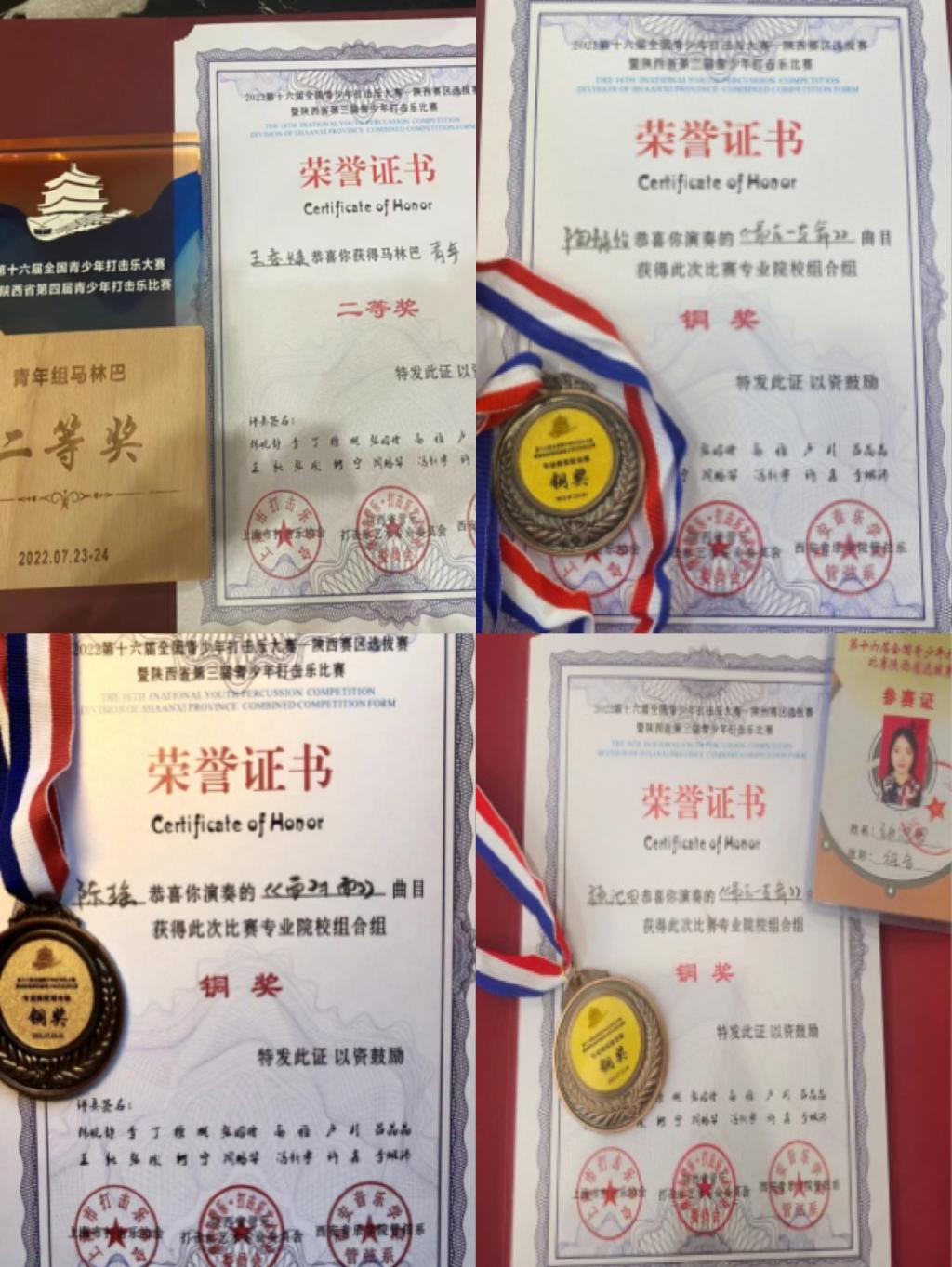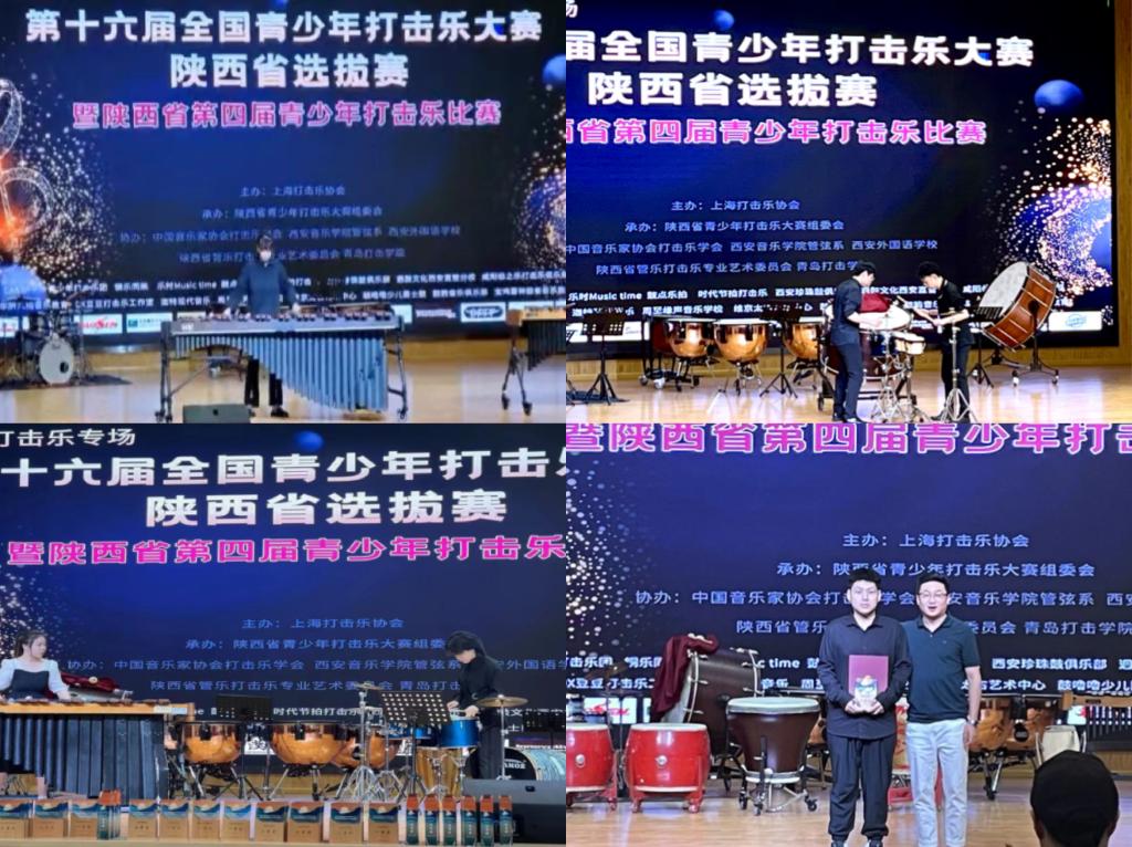 7月23日至24日,我校音乐学院打击乐专业学生赴西安参加第十六届全国青少年打击乐比赛陕西省选拔赛暨第四届陕西省打击乐比赛,该赛事作为国内顶级年度打击乐比赛,也是陕西省最高级别的打击乐专项比赛,我校学生张宝天、张元龙、陈瑶、王春焕、陶静怡、张池田与西安音乐学院、陕西师范大学等高校学生同台竞技参加了多个项目的角逐。其中,张宝天参加青年组小军鼓单项比赛获得一等奖。王春焕参加青年组马林巴单项比赛获得二等奖。