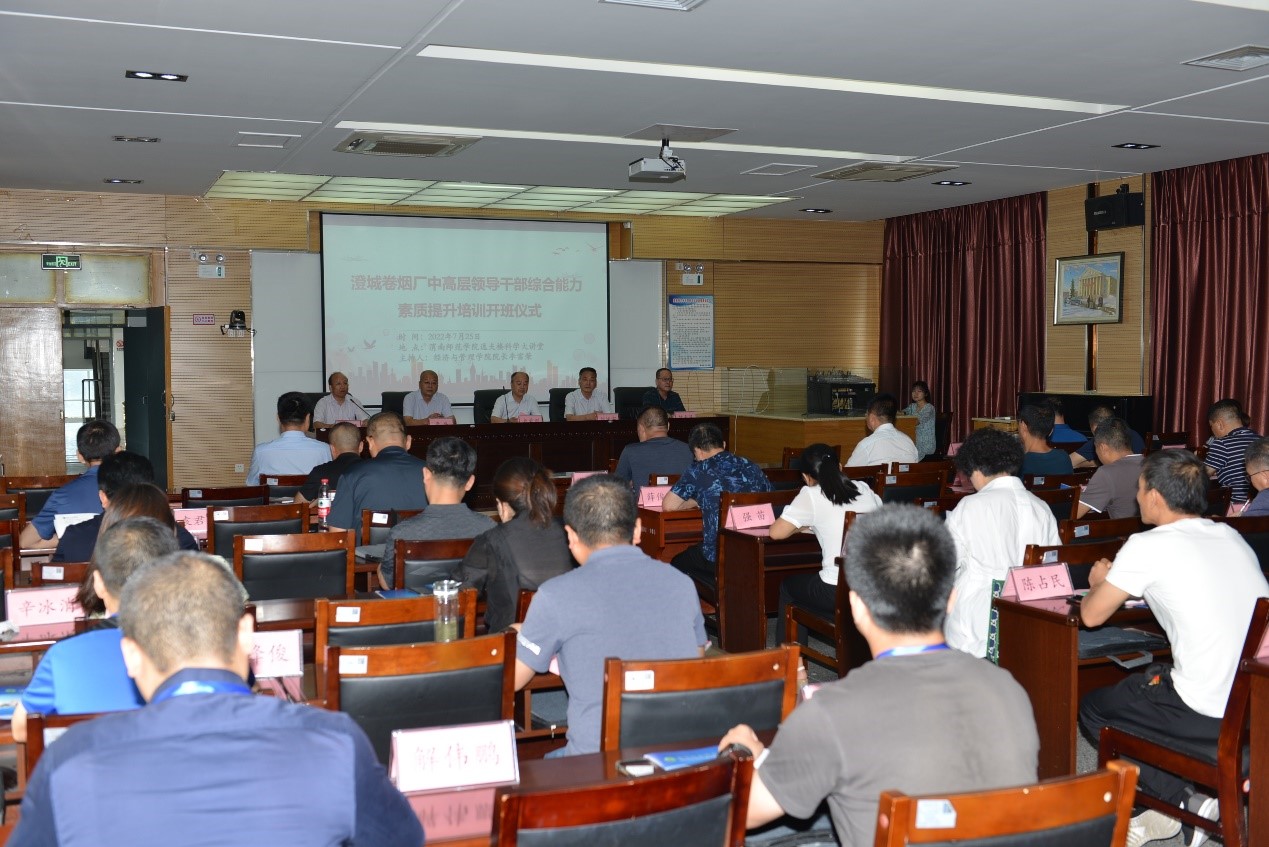 7月25日上午,中烟公司澄城卷烟厂中高层领导干部综合能力素质提升活动开班仪式在我校逸夫楼科学大讲堂举行。副校长卢爱刚、经济与管理学院党总支书记魏光民,澄城卷烟厂厂长刘振宇、党委书记李磊及其他澄城卷烟厂中高层领导干部出席了此次开班仪式。仪式由经济与管理学院院长李富荣主持。
