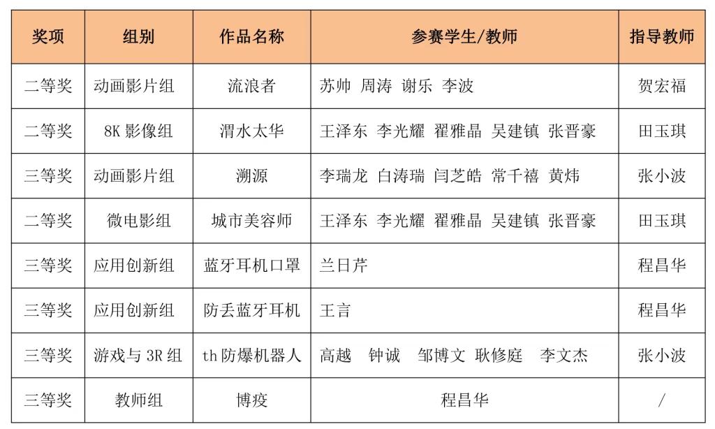 8月25日,中国好创意暨全国数字艺术设计大赛国赛获奖名单发布,我校传媒学院共有8个项目在动画影片组、8K影像组、微电影组、应用创新组、游戏与3R组和教师组中进入全国总决赛,其中贺宏福、田玉琪老师指导的作品荣获国家级二等奖3项,张小波、程昌华、赵书英老师指导的作品荣获三等奖4项,程昌华老师的作品荣获教师组三等奖。同时,我校荣获优秀组织奖。