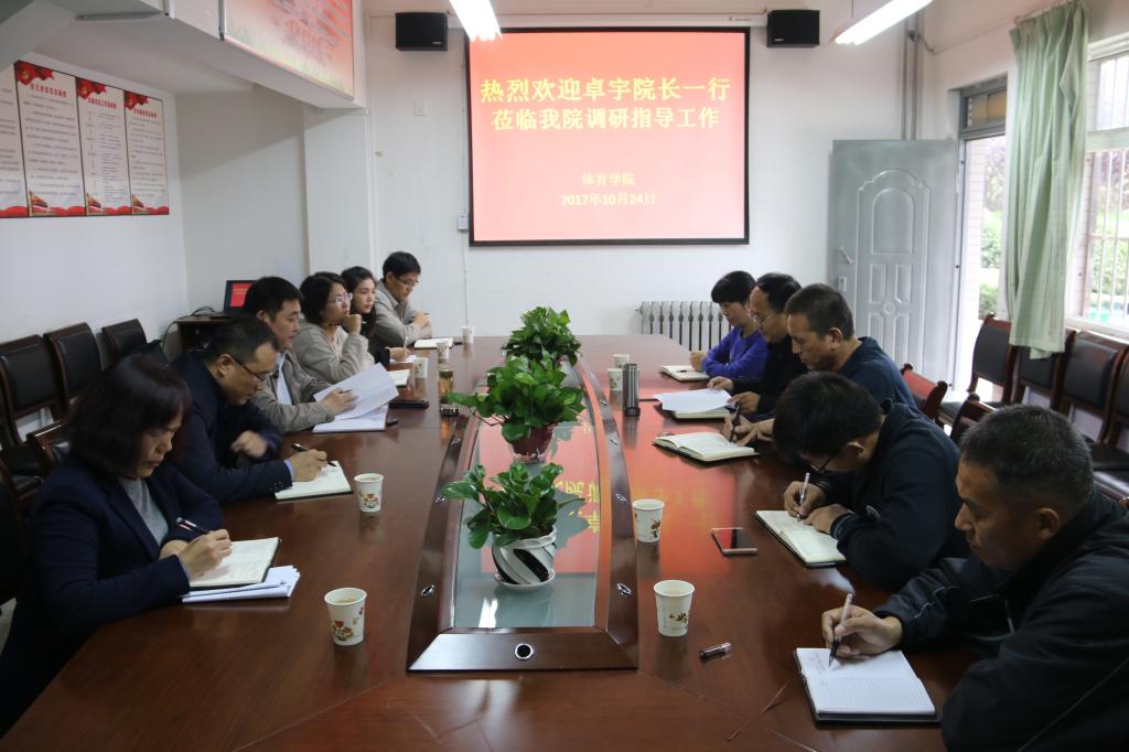 10月24日下午,院长卓宇,教务处处长王菊霞,党政办公室副主任曹强,科学研究处副处长张修兴,学科建设办公室主任袁梁等一行莅临体育学院调研指导工作。体育学院党政领导、专业负责人等同志参加了座谈。