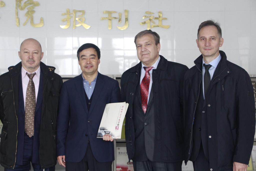 11月6日,学校党委书记丁德科同志陪同莫斯科国立师范大学前副校长康斯坦丁·彼得洛维奇·多岑科,副校长瓦西里·维亚切斯拉夫维奇·斯特拉霍夫和国际交流处处长维亚切斯洛夫·瓦列里耶维奇·克鲁克罗夫一行来到报刊社考察。