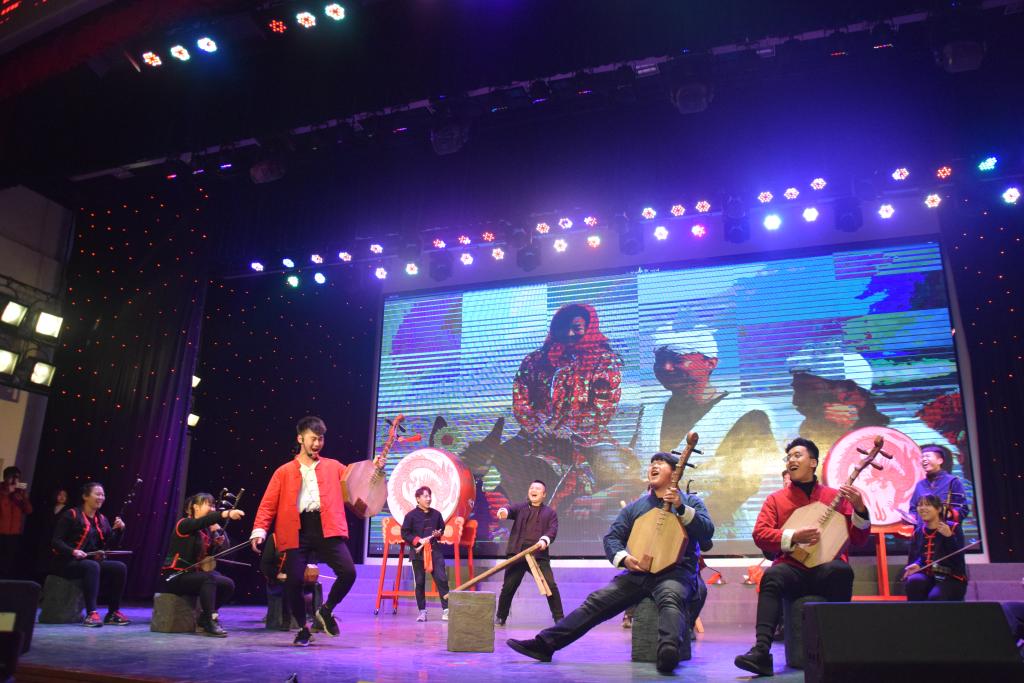 在首先举行的汇报演出中,由我校学生演唱老腔传统曲目《关中古歌》《将令一声震山川》《太阳圆月亮湾》;还有渭南市职业技术学院创作的《biangbiang面》等共9个节目。表演古朴雄浑,唱腔高亢激越,舞姿曼妙动人,说唱诙谐明快,精彩的节目博得300多名观摩者的阵阵掌声。
