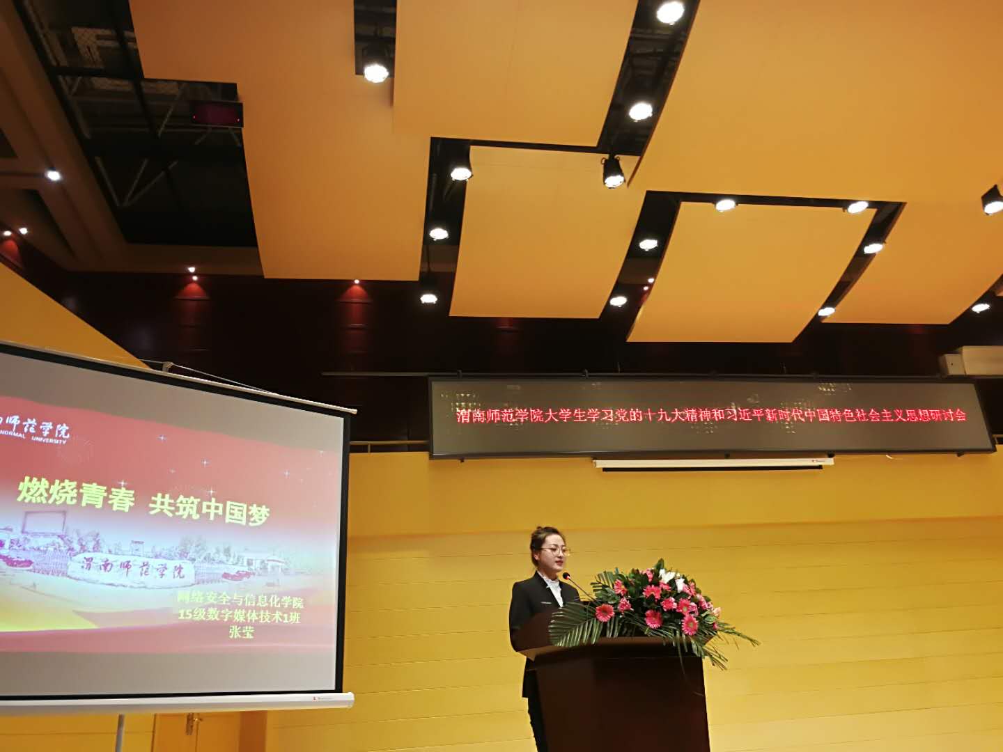 丝绸之路艺术学院的陈卓在题为《放飞青春梦想 书写人生华章》的发言中表示,文化自信正在为实现中华民族伟大复兴中国梦提供源源不断的强大精神动力,作为艺术学院的学生,优秀中华传统文化的继承发扬使我们新时代下青年们信心满满、倍感自豪,要以更加坚定的理想信念,更加自信的人生姿态,更加蓬勃的创造活力,勇立在新时代的潮头。