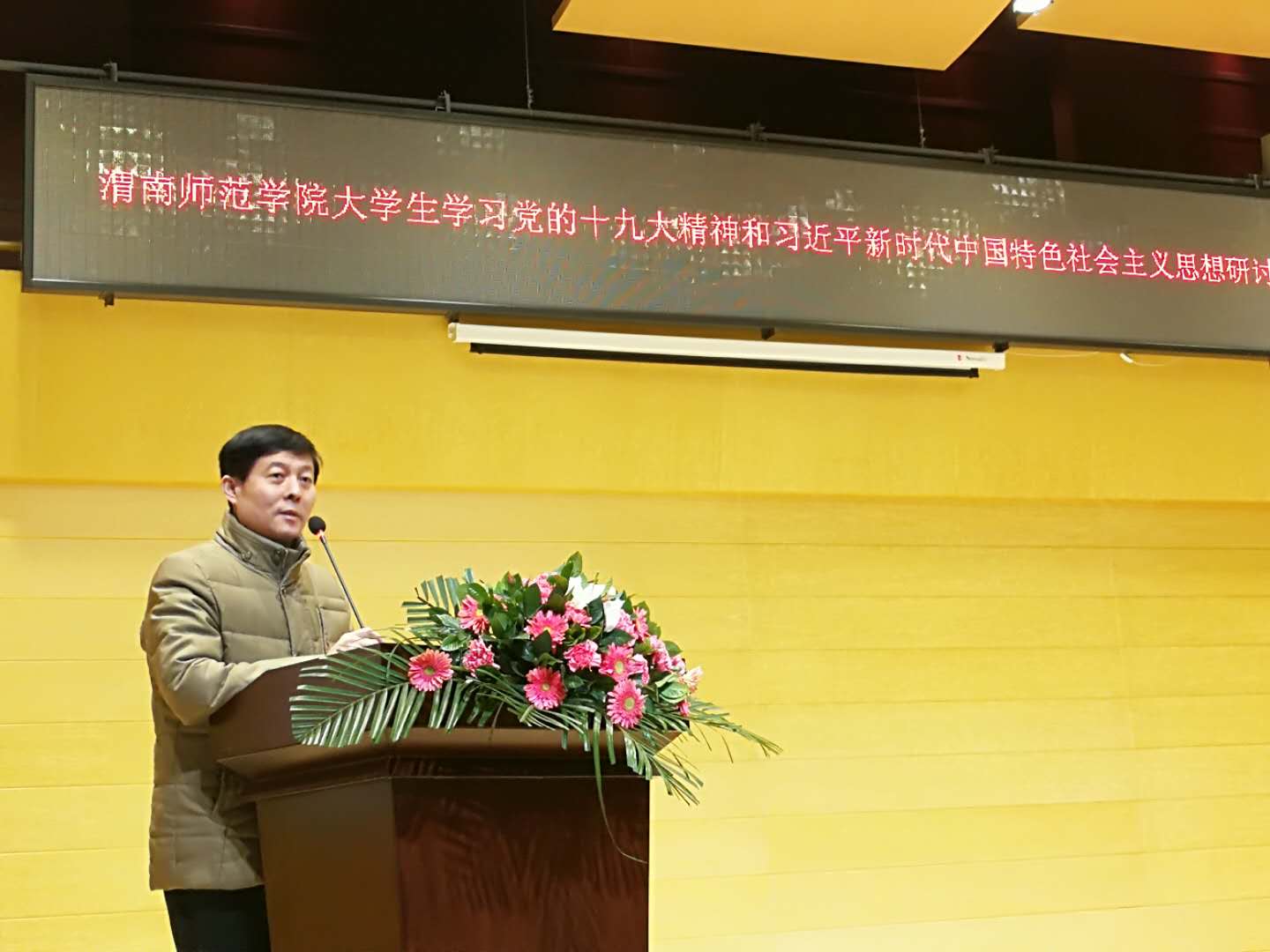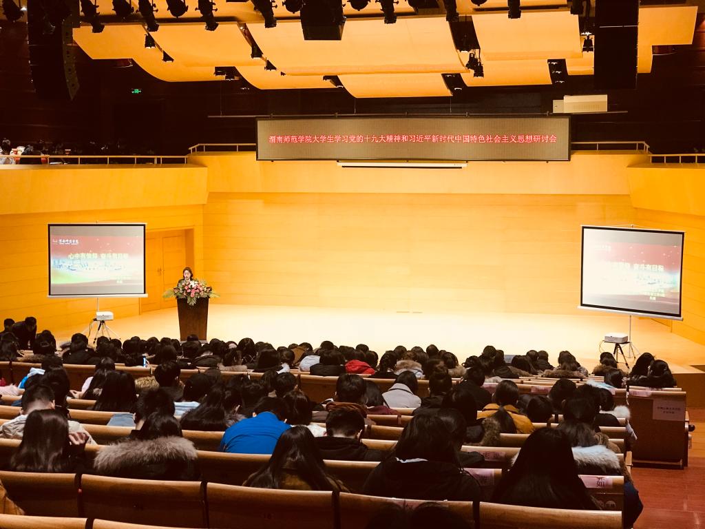 2018年1月3日下午,我校“大学生学习党的十九大精神和习近平新时代中国特色社会主义思想研讨会”在华金音乐厅隆重召开。学校党委书记丁德科、党委副书记任健、党委委员、副院长李海龙出席会议,学校宣传部、学工部、人武部、团委等部门负责人,各二级学院分党委、党总支书记、副书记、学工办主任、学生党支部书记、专兼职辅导员,以及学生干部、学生党员、入党积极分子代表共500余人参加大会。会议由学工部部长王俊安主持。
