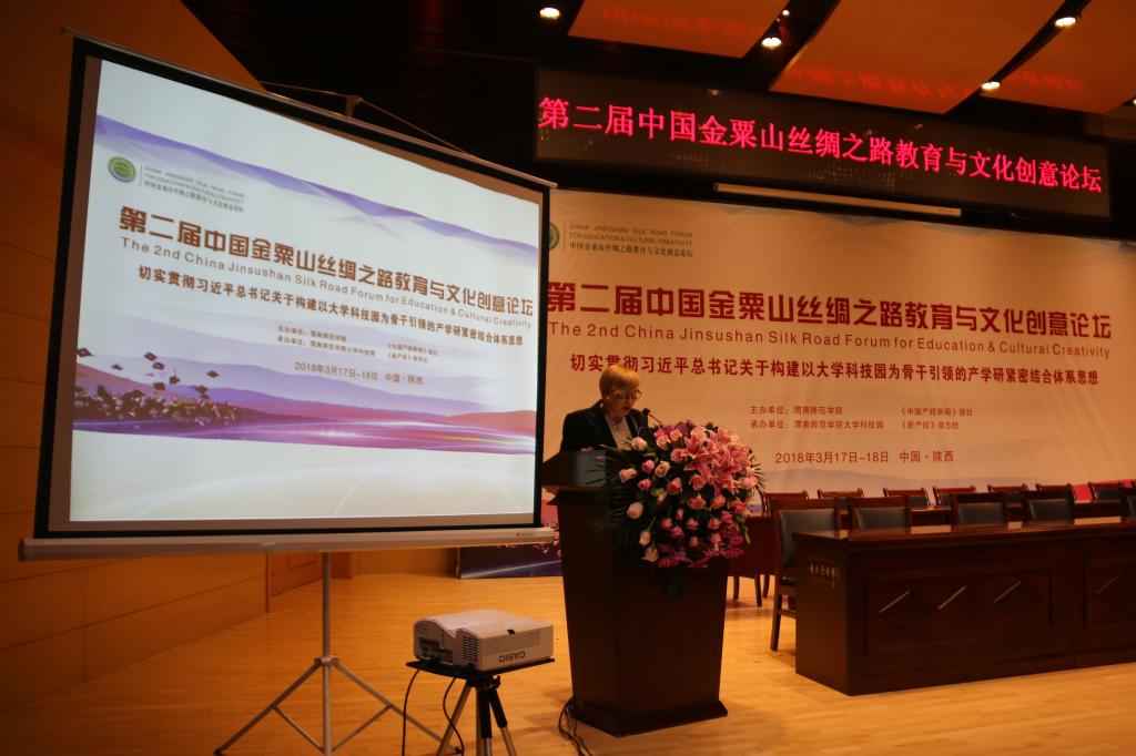 在3月18日渭南师范学院举办的第二届中国金粟山丝绸之路教育与文化创意论坛上,渭南师范学院俄罗斯研究中心主任,莫斯科师范大学教授玛格丽特博士为与会嘉宾和师生作报告。