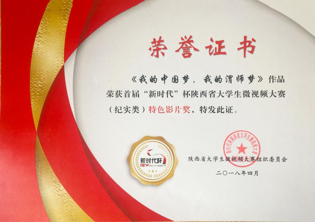 4月19日,2018年首届“新时代”杯陕西省大学生微视频大赛颁奖典礼在西安交通大学举行。由我校全媒体中心微视频工作室创作的《我的中国梦·我的渭师梦》和《大学生提笔忘字新思考》两部作品荣获纪实类“特色影片奖”,于占豪荣获“优秀指导教师奖”。