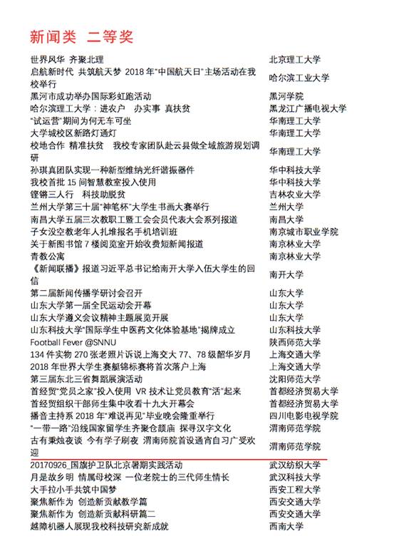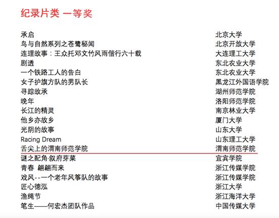 其中,《舌尖上的渭南师范学院》获得纪录片类一等奖;《“一带一路”沿线国家留学生齐聚仓颉庙探寻汉字文化》、《渭南师院首设通宵自习室广受欢迎》获得新闻类二等奖;《向创幸福的方向前进MV》及《天南地北渭师人》分别荣获综艺类、形象类二等奖。