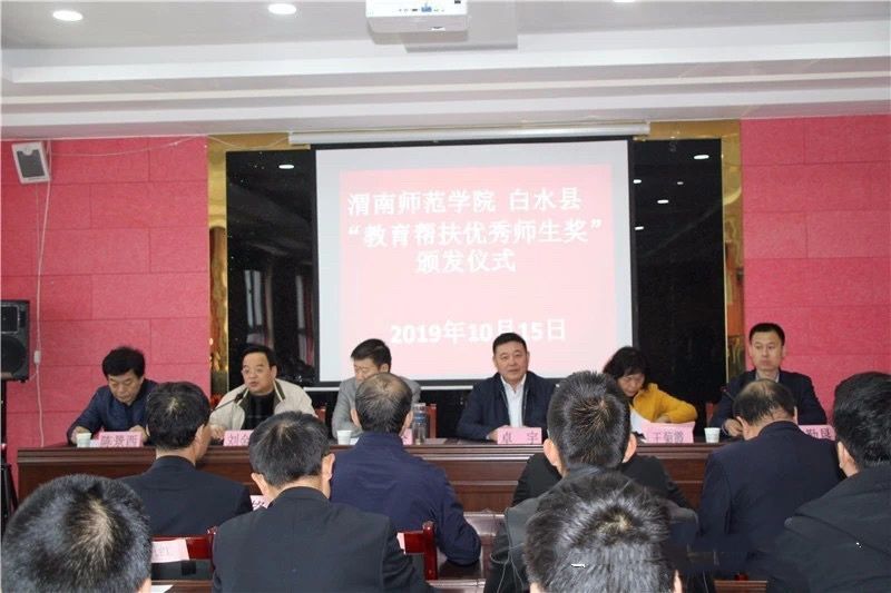 10月15日上午,渭南师范学院党委书记卓宇一行赴白水县,在尧禾镇中参加了“渭南师范学院教育帮扶优秀师生奖”的颁发仪式。副校长王菊霞、党政办公室、扶贫办副主任张勤恳,教务处处长孙宏恩,学工部副部长陈景西参加了颁发仪式,白水县副县长张栓全出席了活动并讲话。颁奖仪式由白水县教育局机关党委书记刘金房主持。