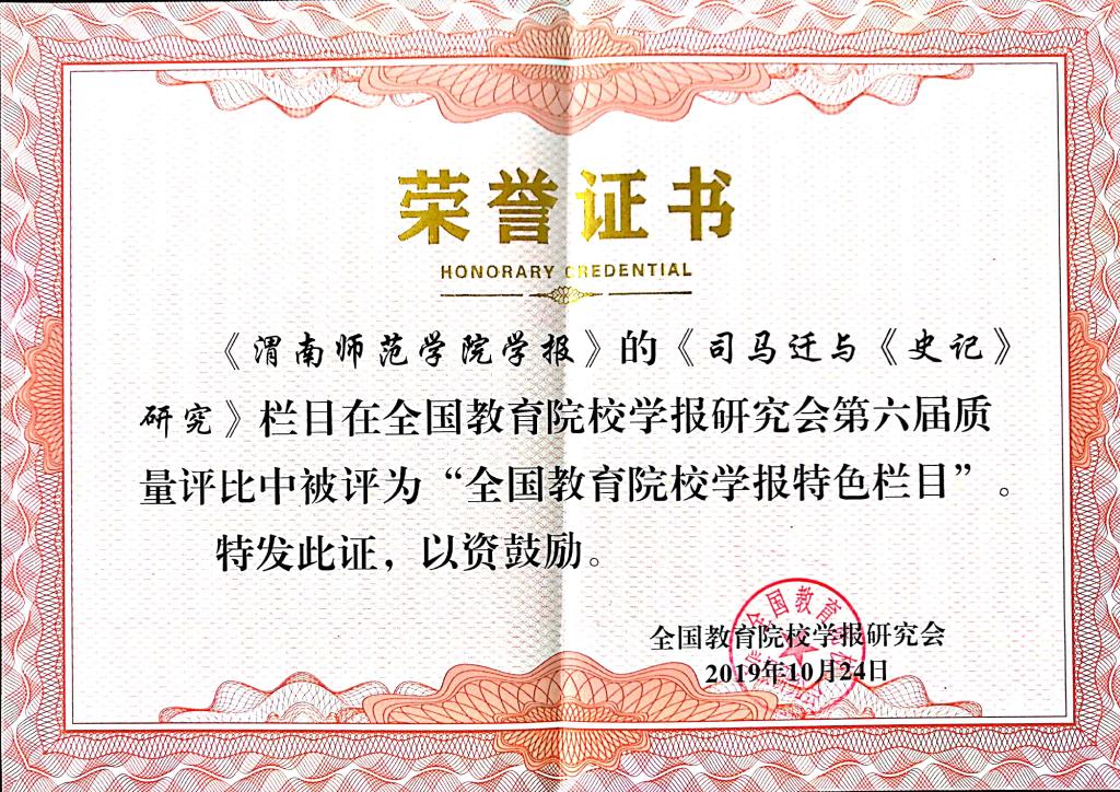 日前,从全国教育院校学报研究会2019年学术年会获悉,《渭南师范学院学报》荣获“全国教育院校学报精品期刊”,教育部名栏“司马迁与《史记》研究”荣获“全国教育院校学报特色栏目”。此外,詹歆睿、牛怀岗同志分别荣获全国教育院校学报研究会“妙笔奖”。