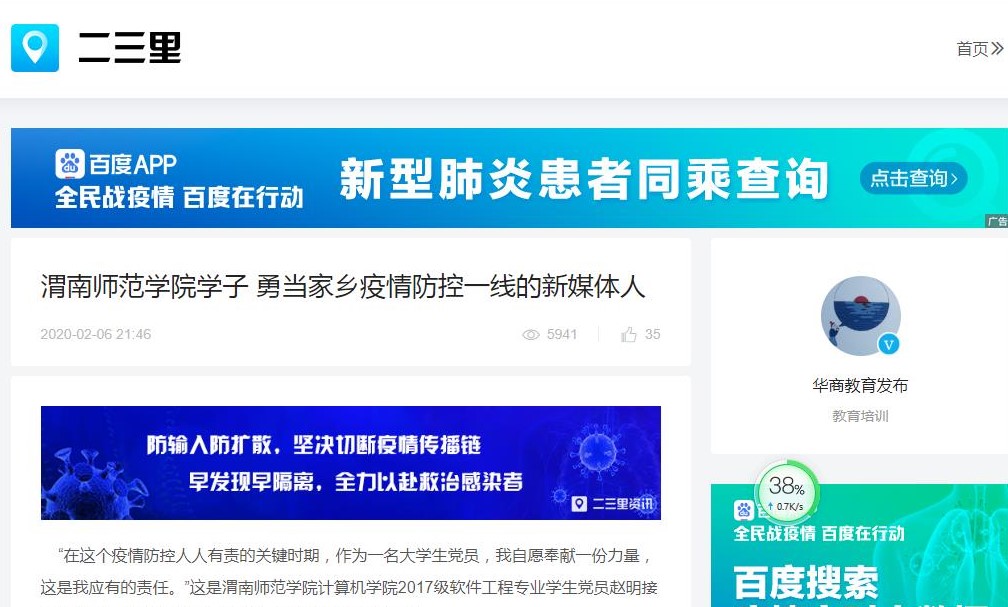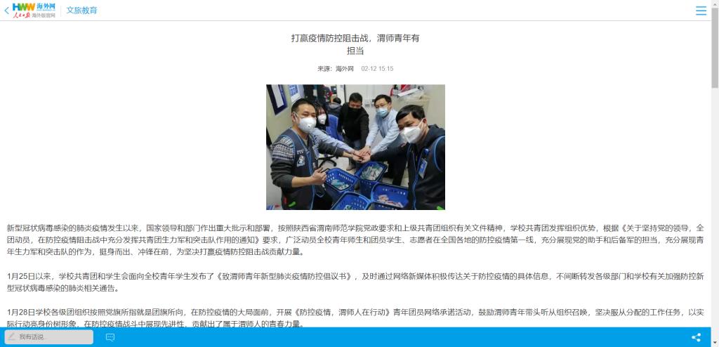 人民日报海外版官网2月12日转载的《打赢疫情防控阻击战,渭师青年有担当》激励了更多学生加入到疫情防控志愿者队伍中,在家乡西安市鄠邑区秦渡街道秦南村村委会做疫情防控志愿者的计算机学院学生赵明说“看到咱们的报道中那么多和我一样的学生在助力这场没有硝烟的战役,作为一名学生,国家和学校培育了我,我应该去感恩国家,回报社会,而且我还是一名党员,更应该敢于担当。”
