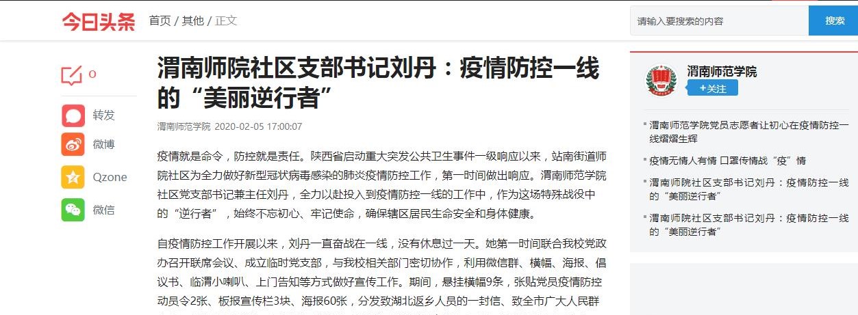 中国教育在线网站刊载了《打赢疫情防控阻击战:渭南师范学院“渭师心援”在行动》《渭南师范学院精准施策加强服务确保延期开学不误课》等12篇报道;搜狐教育刊载了《渭南师范学院推出居家运动指导系列视频》等9篇;网易陕西刊载了《渭南师范学院党员志愿者让初心在疫情防控一线熠熠生辉》等9篇;华商传媒集团“二三里”刊载了《渭南师范学院学子勇当家乡疫情防控一线的新媒体人》等6篇;“一点资讯”刊载了《我在湖北,向母校报平安——来自莫斯科艺术学院湖北籍学子的信》等9篇;今日头条转载了《守初心担使命疫情防控一线的“美丽逆行者”——师院社区支部书记刘丹》,还有多家媒体官方微博、微信公众号转载了我校相关报道。