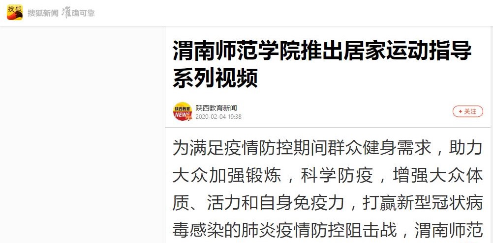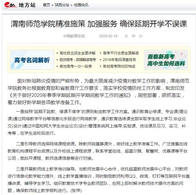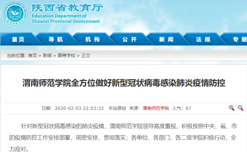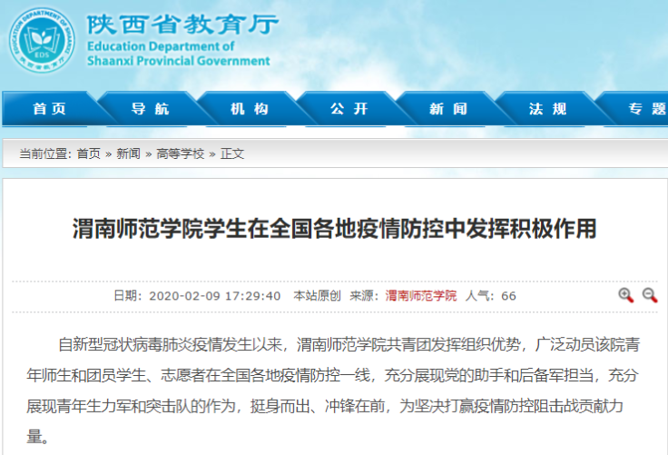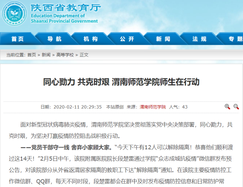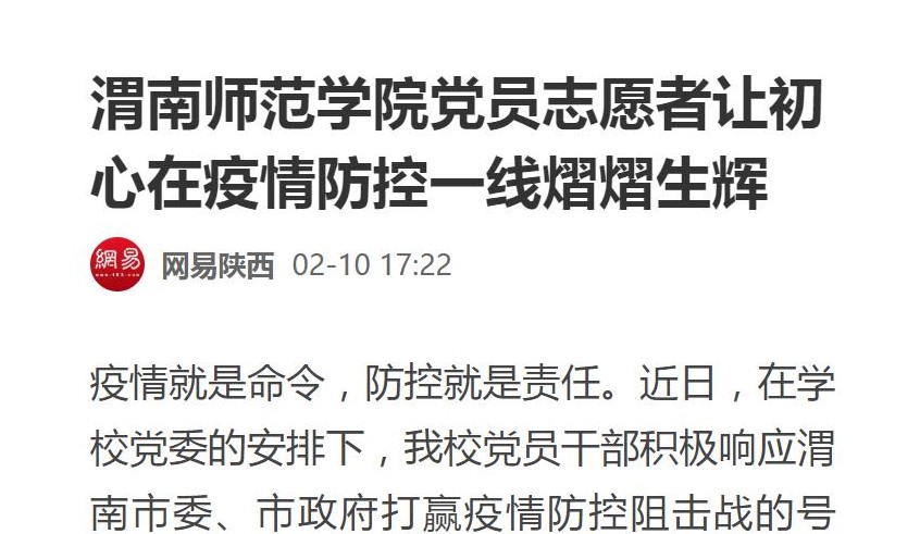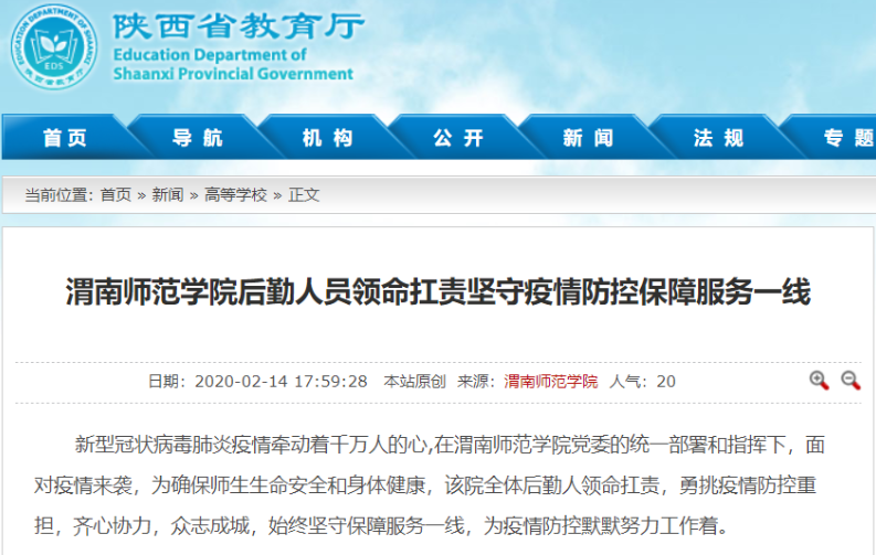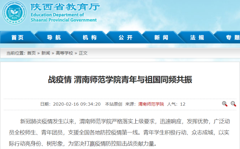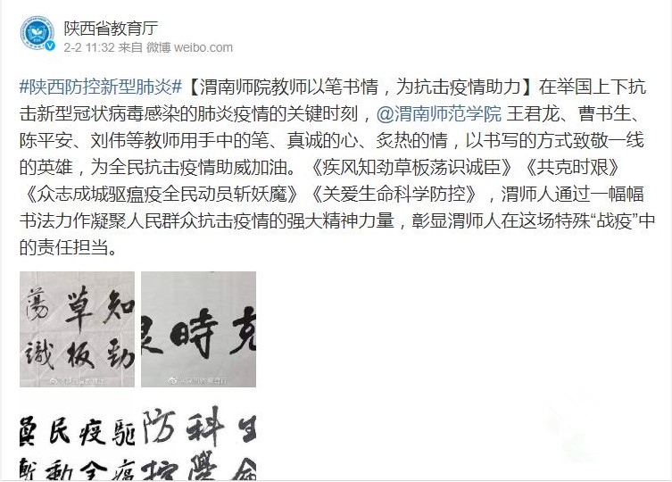 陕西省教育厅官网全文刊载了《渭南师范学院全方位做好新型冠状病毒感染肺炎疫情防控》《抗击疫情,渭南师范学院统一战线在行动》《渭南师范学院学生在全国各地疫情防控中发挥积极作用》《同心勠力 共克时艰 渭南师范学院师生在行动》《渭南师范学院后勤人员领命扛责坚守疫情防控保障服务一线》《战疫情 渭南师范学院青年与祖国同频共振》等6篇通讯。陕西省教育厅官方微博刊载了《渭南师范学院教师以笔书情,为抗击疫情助力》等3篇报道。