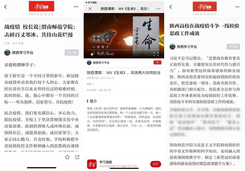 学习强国平台全文刊载了书记、校长写给渭师学子题为《击碎百丈寒冰,共待山花烂漫!》的一封信,推送了我校教师崔峰作曲编曲的歌曲《生命》,在《陕西高校在战疫情斗争一线检验思政工作成效》一文中报道了我校马克思主义学院将疫情防控的中省文件精神和科学知识,及时融入到思政课网络教学中,制定《新型冠状病毒感染的肺炎疫情时期思政课教学方案》的举措,该举措在2月14日中国教育报电子版《陕西高校师生全力以赴打赢疫情防控阻击战——“我们凝聚在一起,一定会攻克难关”》一文中也有报道。