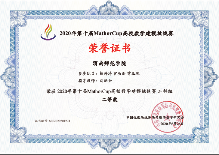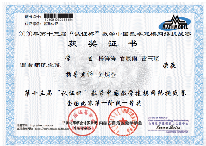 在2020年第十三届“认证杯”数学中国数学建模网络挑战赛中,我校获得了全国一等奖1队,三等奖2队,优秀奖6队的好成绩,这是我校在该项赛事中首次获得一等奖。