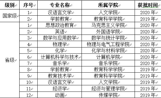 近日,教育部办公厅公布了2020年度国家级和省级一流本科专业建设点名单,我校汉语言文学本科专业获批国家级一流本科专业建设点,思想政治教育、英语、数学与应用数学、物理学、化学、计算机科学与技术、音乐学等7个本科专业获批省级一流本科专业建设点。截止目前,学校已有国家级一流本科专业建设点2个,省级一流本科专业建设点12个。