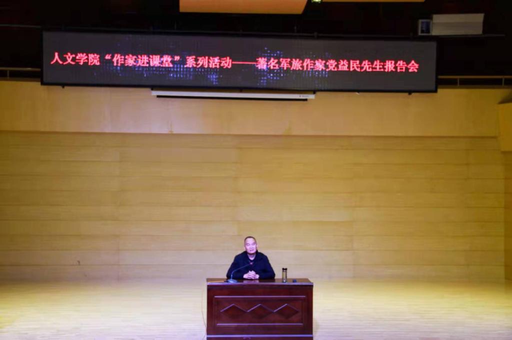 4月26日下午,人文学院在逸夫楼华金音乐厅举办“作家进课堂”活动,特邀著名军旅作家党益民将军作专题报告。副校长曹强主持报告会。