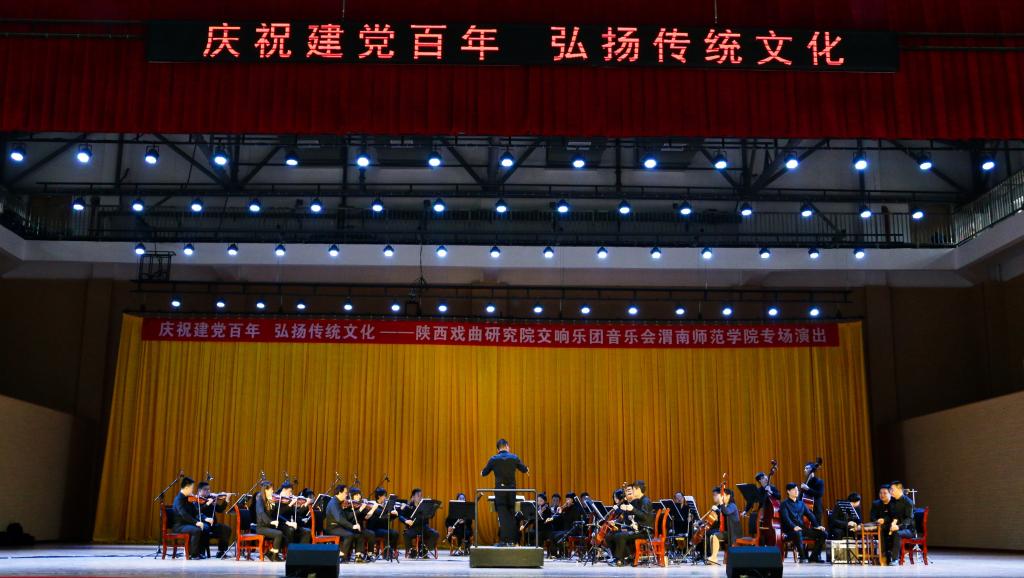 为庆祝党的百年华诞,大力弘扬优秀传统文化,4月27日下午,陕西戏曲研究院交响乐团音乐会渭南师范学院专场演出在学校富平校区举办。党委副书记任健出席并观看演出,学工部、富平校区管委会、后勤服务中心、美术学院、传媒学院等相关部门负责人及师生代表共300余人现场观看聆听。