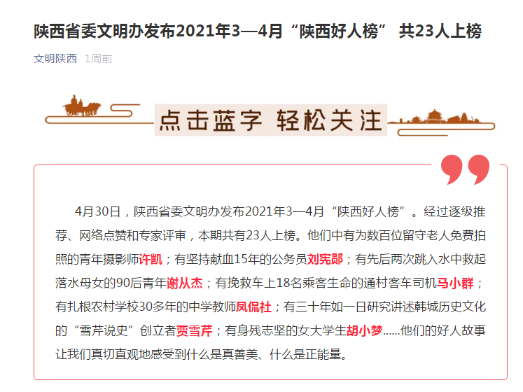 近日,陕西省委文明办发布2021年3—4月“陕西好人榜”,经过逐级推荐、网络点赞和专家评审,本期共有23人上榜。我校人文学院汉语言文学专业学生胡小梦被评为“自强励志”陕西好人。
