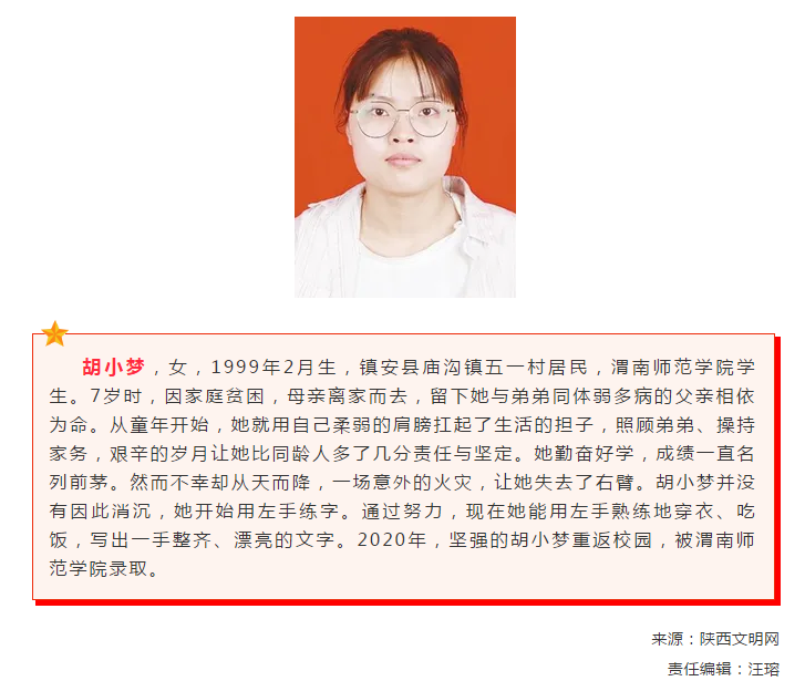 据悉,2020年7月,胡小梦曾被评选为励志自强类“商洛好人”。(通讯员 张晶 孟子祥 审核人 张晶)