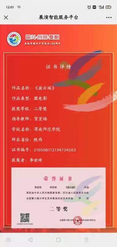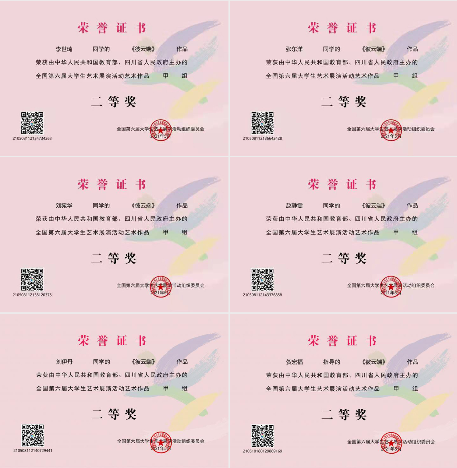 近日,由中华人民共和国教育部、四川省人民政府共同主办的全国第六届大学生艺术展演活动在成都落下帷幕,由我校传媒学院教师贺宏福指导,李世琦、张东洋、刘宛华、赵静雯、刘伊丹、张大伟同学创作的动画《彼云端》获艺术作品类甲组二等奖,这是我校参加此项赛事以来取得的最好成绩。