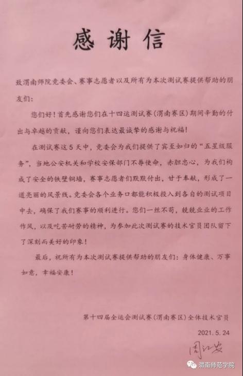 第十四届全国运动会篮球项目测试赛(渭南赛区),中国篮协、省组委会和市执委会给予了大量的关心、支持和指导,为竞委会提供了全方位的技术指导和运行指挥。同时,在竞委会各职能处室高度重视、合力协作下,各方面工作按照测试赛要求一切保障到位,测试赛举行得全面有序、安全顺利、精彩圆满,得到了第十四届全运会测试赛(渭南赛区)全体技术官员的感谢。感谢信原文如下: