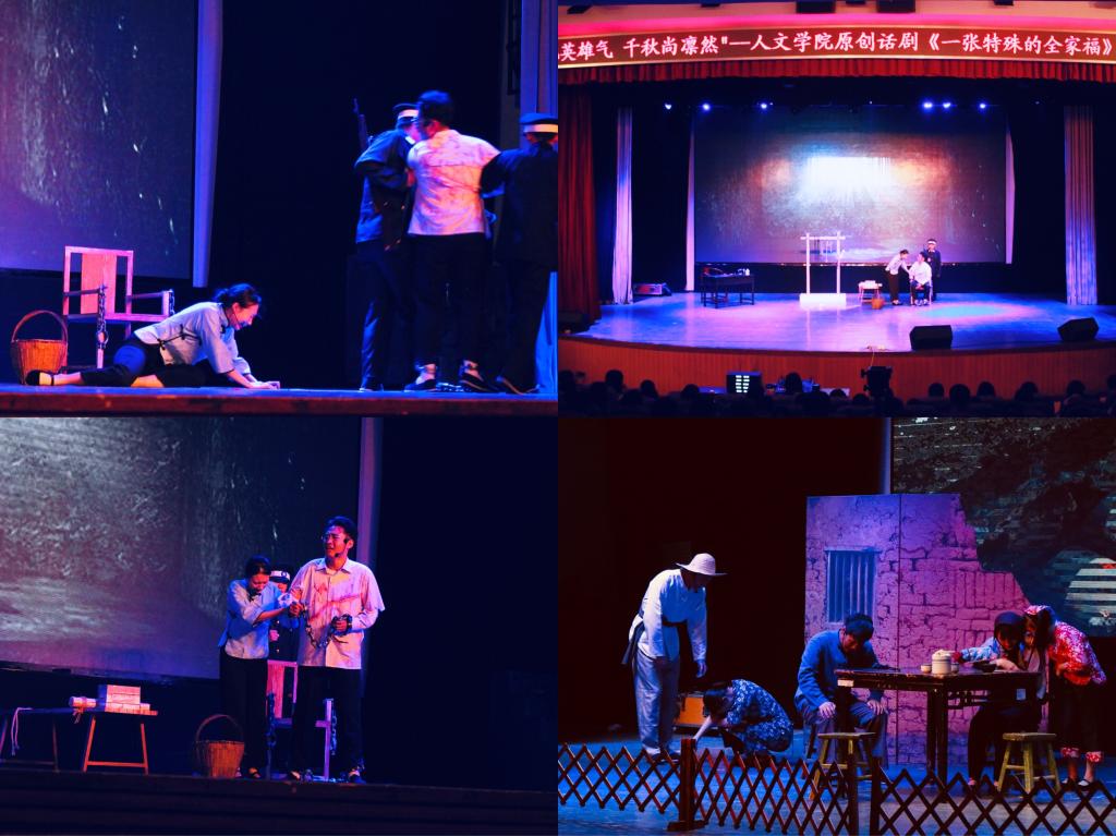 《一张特殊的全家福》是人文学院师生根据共产党员温继厚烈士的真实事迹创作的原创话剧。话剧讲述了渭华起义领导者之一、革命烈士温济厚不忘初心,为党和人民的解放事业献出宝贵生命的感人事迹。1928年5月1日渭华起义爆发后,国民党反动派四处搜捕共产党员和进步人士。时任华县七里寺小学(现柳溪小学)校长、中共七里寺支部书记的温济厚不幸被捕入狱,历经严刑拷打,最终英勇就义,年仅25岁。在生命的最后时刻,他依然没有忘记共产主义信仰,振臂高呼:“共产党人是斩不尽杀不绝的!”“共产党万岁!”温济厚牺牲后,他的妻子温曹氏和村民温志德一起搬回他的遗体,在村西头的小庙里拍下了一张特殊的全家福。