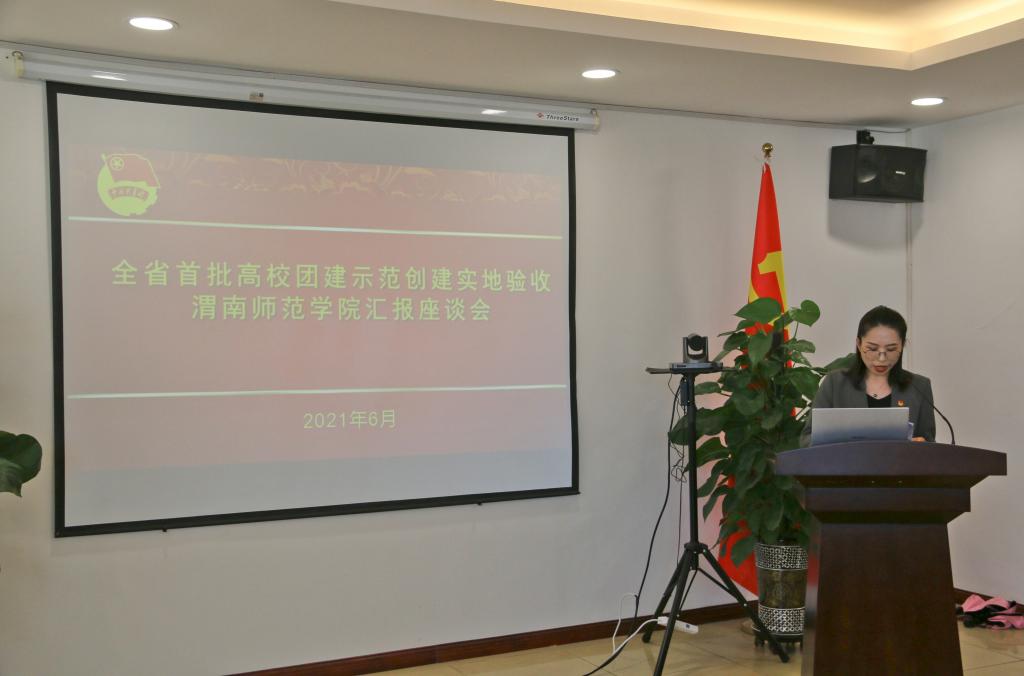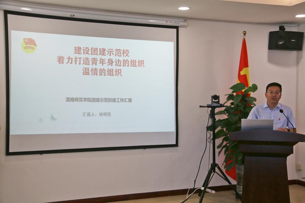 学校团委书记姚明亮从立德树人落细、实践创新拓展、校园文化品牌提升、基层组织强基固本、团学改革创新“五大工程”等方面汇报了我校团建示范创建的创新举措;从青马工程、第二课堂成绩单建设两个方面介绍了我校团建示范创建的特色亮点;从思想引领、组织建设、队伍建设、体制机制建设、强化服务等方面对我校共青团努力的方向进行展望。省级团建示范创建工作标杆院系、马克思主义学院团总支书记杨应楠围绕从严治团、加强思想引领、打造团属活动品牌、筑牢网络工作平台阵地等方面对标杆院系的创建工作进行汇报。学生党员代表、教育科学学院学前教育181班刘静,学生团员代表、数学与统计学院数学与应用数学181班周宇甜分别从“青马”学员心得体会、公寓团组织学生干部的主要任务等方面做了分享交流。
