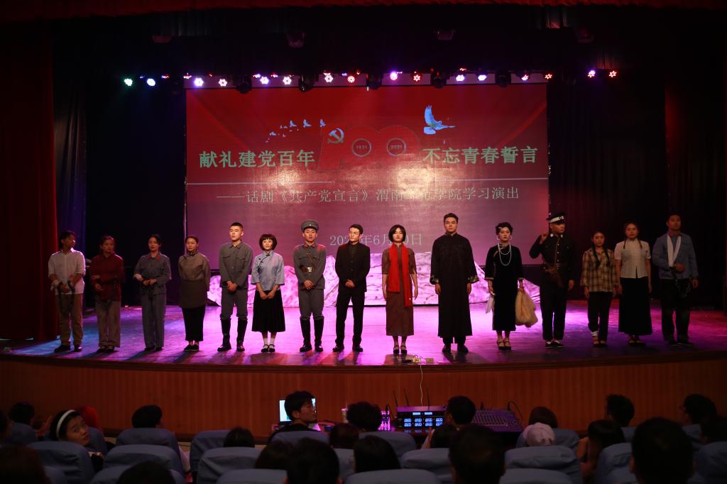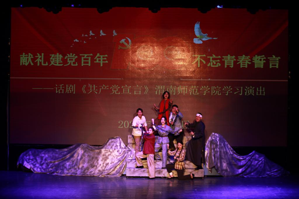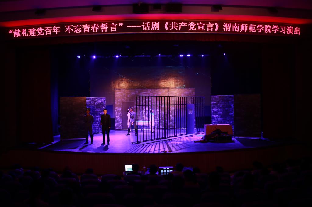 为庆祝中国共产党成立100周年,深入贯彻落实习近平总书记在党史学习教育动员大会上的重要讲话精神,引导我校师生从百年党史中接受政治淬炼、汲取精神力量、领悟先进思想,6月10日,由陕西省委宣传部、陕西省委教育工委和共青团陕西省委主办,我校党史学习教育领导小组办公室、团委、音乐学院党总支承办的“献礼建党百年 不忘青春誓言”——话剧《共产党宣言》渭南师范学院学习演出在学校朝阳校区首演。