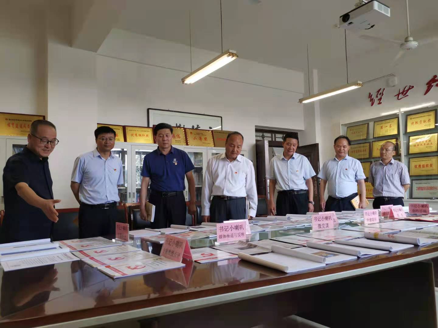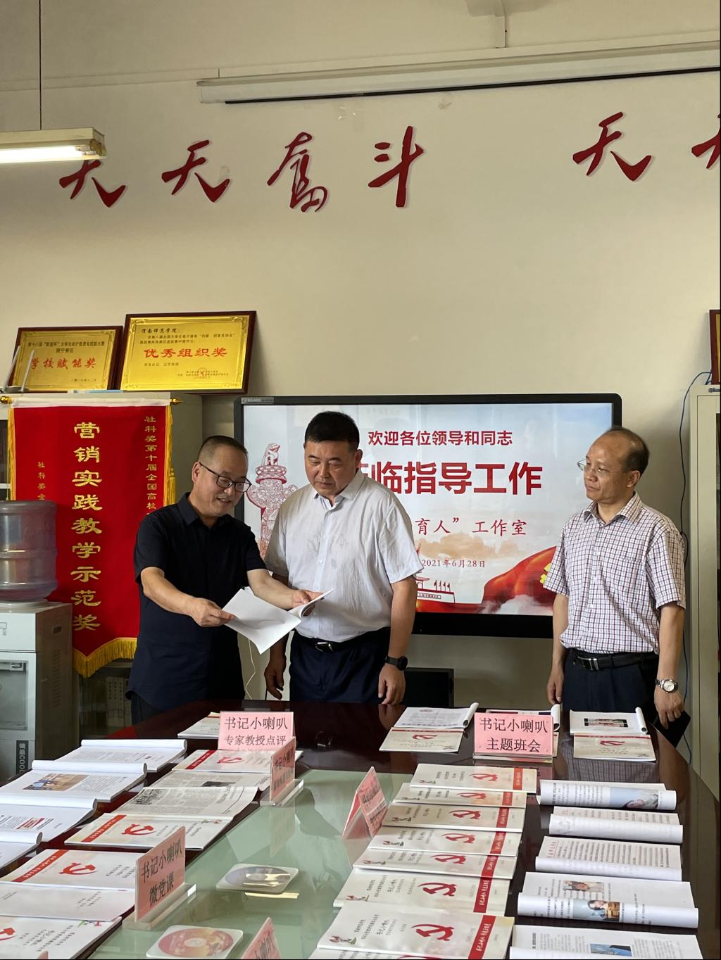 6月28日下午,校长赵曼,党委副书记任健,党委副书记、纪委书记肖耀刚,副校长常青林,党委委员、组织部部长凌朝栋一同观看了“书记小喇叭”思政育人成果展。在认真查看材料后大家一致认为,“书记小喇叭”的育人形式、内容和效果切合党的时代要求、围绕学校中心工作、符合学生思想实际,是近年来我校思想政治教育的特色栏目,受到了师生的欢迎和好评。