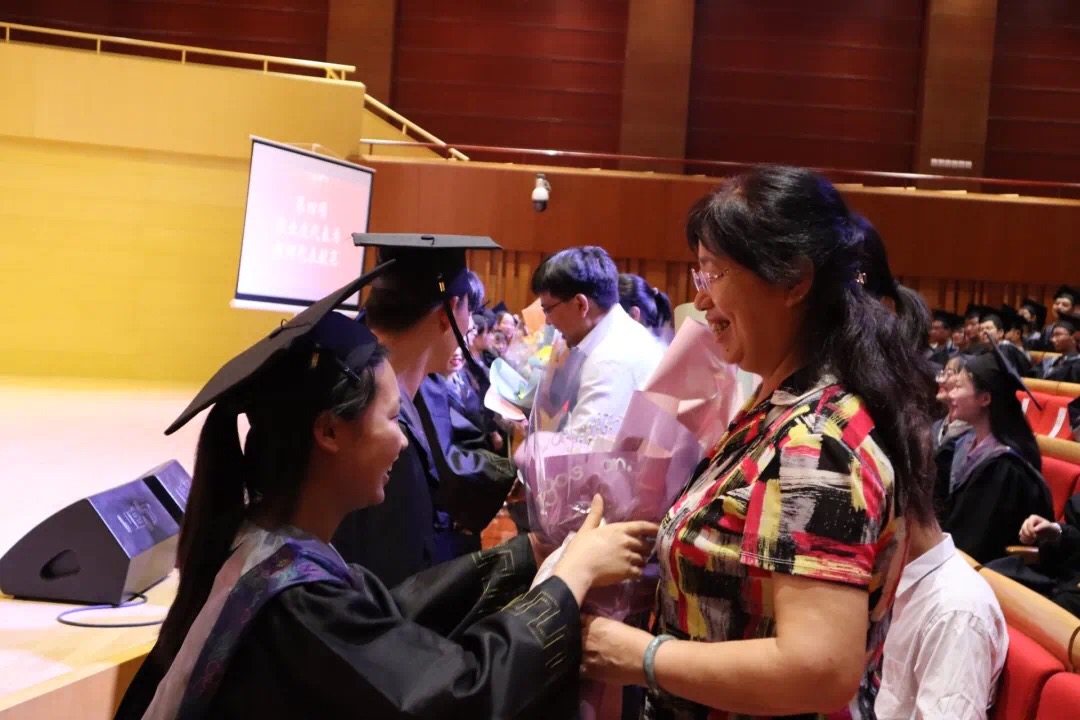 毕业生代表向教师代表献花,感谢师长一路陪伴、辛苦栽培,短暂相逢的美好将永不忘怀。